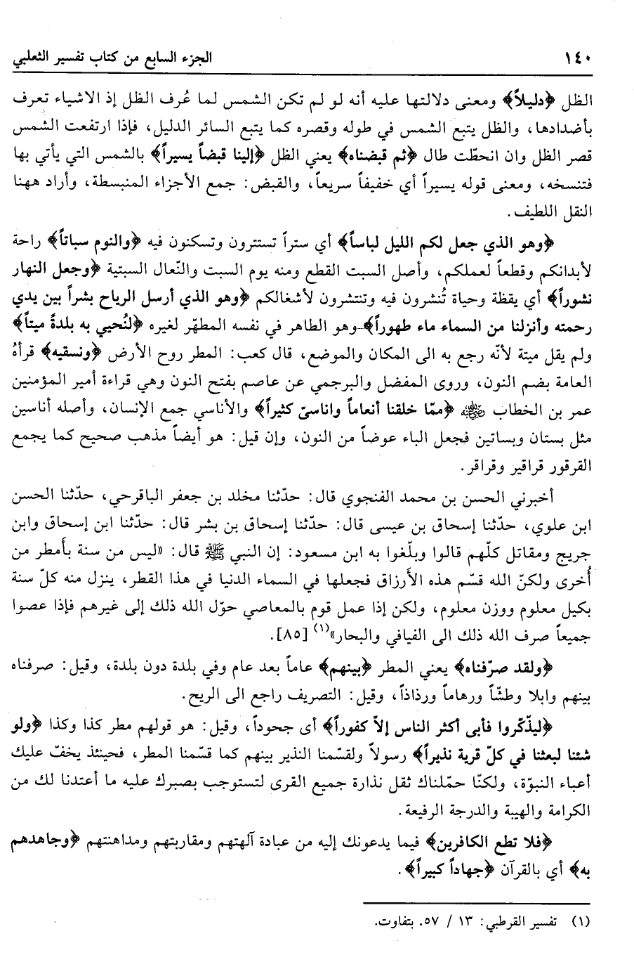 وَهُوَ الَّذِي جَعَلَ لَكُمُ اللَّيْلَ لِباساً أي سترا تستترون وتسكنون فيه وَالنَّوْمَ سُباتاً راحة لأبدانكم وقطعا لعملكم، وأصل السبت القطع ومنه يوم السبت والنّعال السبتية وَجَعَلَ النَّهارَ نُشُوراً أي يقظة وحياة تنشرون فيه وتنتشرون لأشغالكم وَهُوَ الَّذِي أَرْسَلَ الرِّياحَ بُشْراً بَيْنَ يَدَيْ رَحْمَتِهِ وَأَنْزَلْنا مِنَ السَّماءِ ماءً طَهُوراً وهو الطاهر في نفسه المطهّر لغيره لِنُحْيِيَ بِهِ بَلْدَةً مَيْتاً ولم يقل ميتة لأنّه رجع به الى المكان والموضع، قال كعب: المطر روح الأرض وَنُسْقِيَهُ قرأه العامة بضم النون، وروى المفضل والبرجمي عن عاصم بفتح النون وهي قراءة أمير المؤمنين عمر بن الخطاب رضي الله عنه مِمَّا خَلَقْنا أَنْعاماً وَأَناسِيَّ كَثِيراً والأناسي جمع الإنسان، وأصله أناسين مثل بستان وبساتين فجعل الباء عوضا من النون، وإن قيل: هو أيضا مذهب صحيح كما يجمع القرقور قراقير وقراقر.