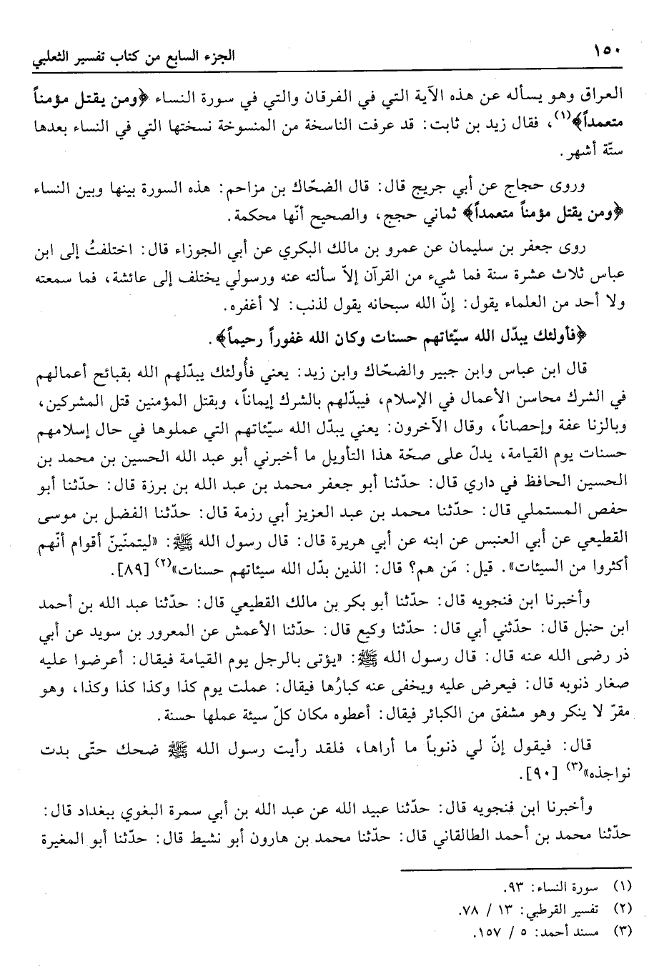 العراق وهو يسأله عن هذه الآية التي في الفرقان والتي في سورة النساء وَمَنْ يَقْتُلْ مُؤْمِناً مُتَعَمِّداً «1» ، فقال زيد بن ثابت: قد عرفت الناسخة من المنسوخة نسختها التي في النساء بعدها ستّة أشهر.