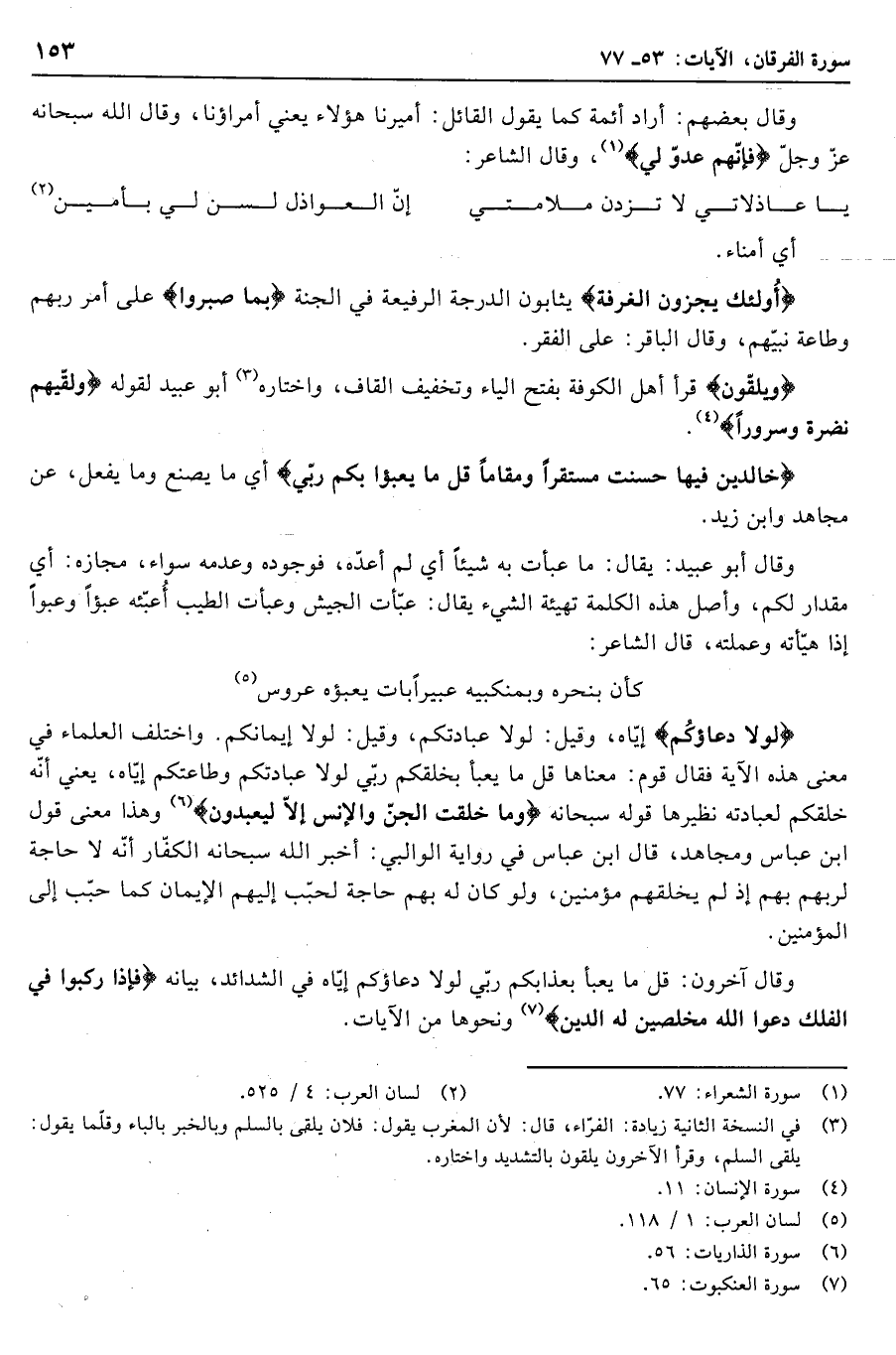 «5» لَوْلا دُعاؤُكُمْ إيّاه، وقيل: لولا عبادتكم، وقيل: لولا إيمانكم. واختلف العلماء في معنى هذه الآية فقال قوم: معناها قل ما يعبأ بخلقكم ربّي لولا عبادتكم وطاعتكم إيّاه، يعني أنّه خلقكم لعبادته نظيرها قوله سبحانه وَما خَلَقْتُ الْجِنَّ وَالْإِنْسَ إِلَّا لِيَعْبُدُونِ «6» وهذا معنى قول ابن عباس ومجاهد، قال ابن عباس في رواية الوالبي: أخبر الله سبحانه الكفّار أنّه لا حاجة لربهم بهم إذ لم يخلقهم مؤمنين، ولو كان له بهم حاجة لحبّب إليهم الإيمان كما حبّب إلى المؤمنين.