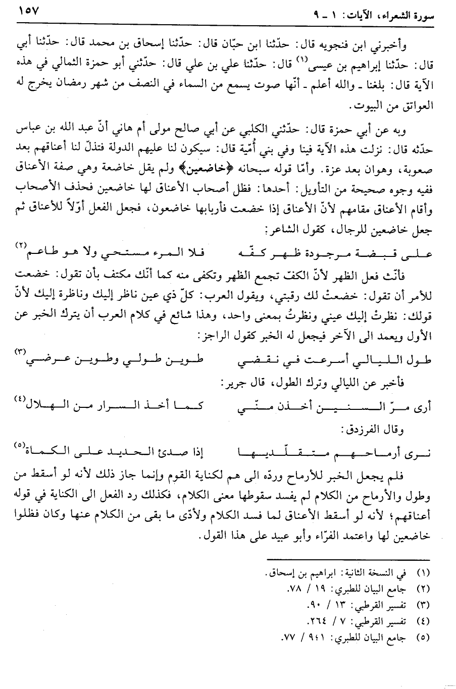 وبه عن أبي حمزة قال: حدّثني الكلبي عن أبي صالح مولى أم هاني أنّ عبد الله بن عباس حدّثه قال: نزلت هذه الآية فينا وفي بني أميّة قال: سيكون لنا عليهم الدولة فتذلّ لنا أعناقهم بعد صعوبة، وهوان بعد عزة. وأمّا قوله سبحانه خاضِعِينَ ولم يقل خاضعة وهي صفة الأعناق ففيه وجوه صحيحة من التأويل: أحدها: فظل أصحاب الأعناق لها خاضعين فحذف الأصحاب وأقام الأعناق مقامهم لأنّ الأعناق إذا خضعت فأربابها خاضعون، فجعل الفعل أوّلا للأعناق ثم جعل خاضعين للرجال، كقول الشاعر: