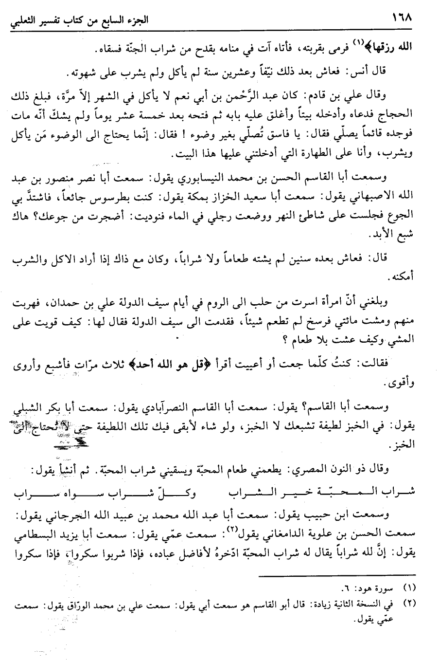 وسمعت أبا القاسم؟ يقول: سمعت أبا القاسم النصرآبادي يقول: سمعت أبا بكر الشبلي يقول: في الخبز لطيفة تشبعك لا الخبز، ولو شاء لأبقى فيك تلك اللطيفة حتى لا تحتاج الى الخبز.