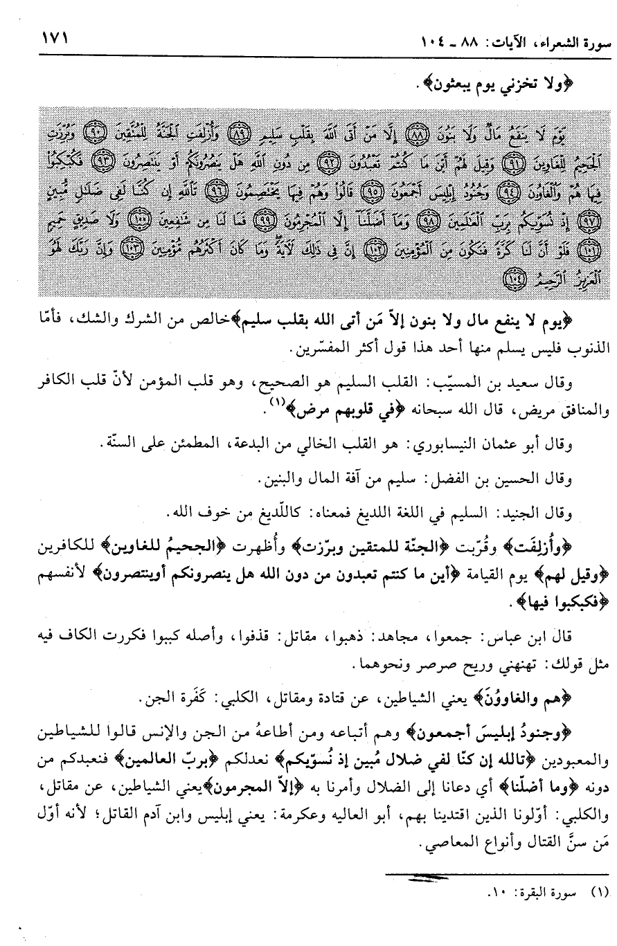 يَوْمَ لا يَنْفَعُ مالٌ وَلا بَنُونَ (88) إِلاَّ مَنْ أَتَى اللَّهَ بِقَلْبٍ سَلِيمٍ (89) وَأُزْلِفَتِ الْجَنَّةُ لِلْمُتَّقِينَ (90) وَبُرِّزَتِ الْجَحِيمُ لِلْغاوِينَ (91) وَقِيلَ لَهُمْ أَيْنَ ما كُنْتُمْ تَعْبُدُونَ (92)