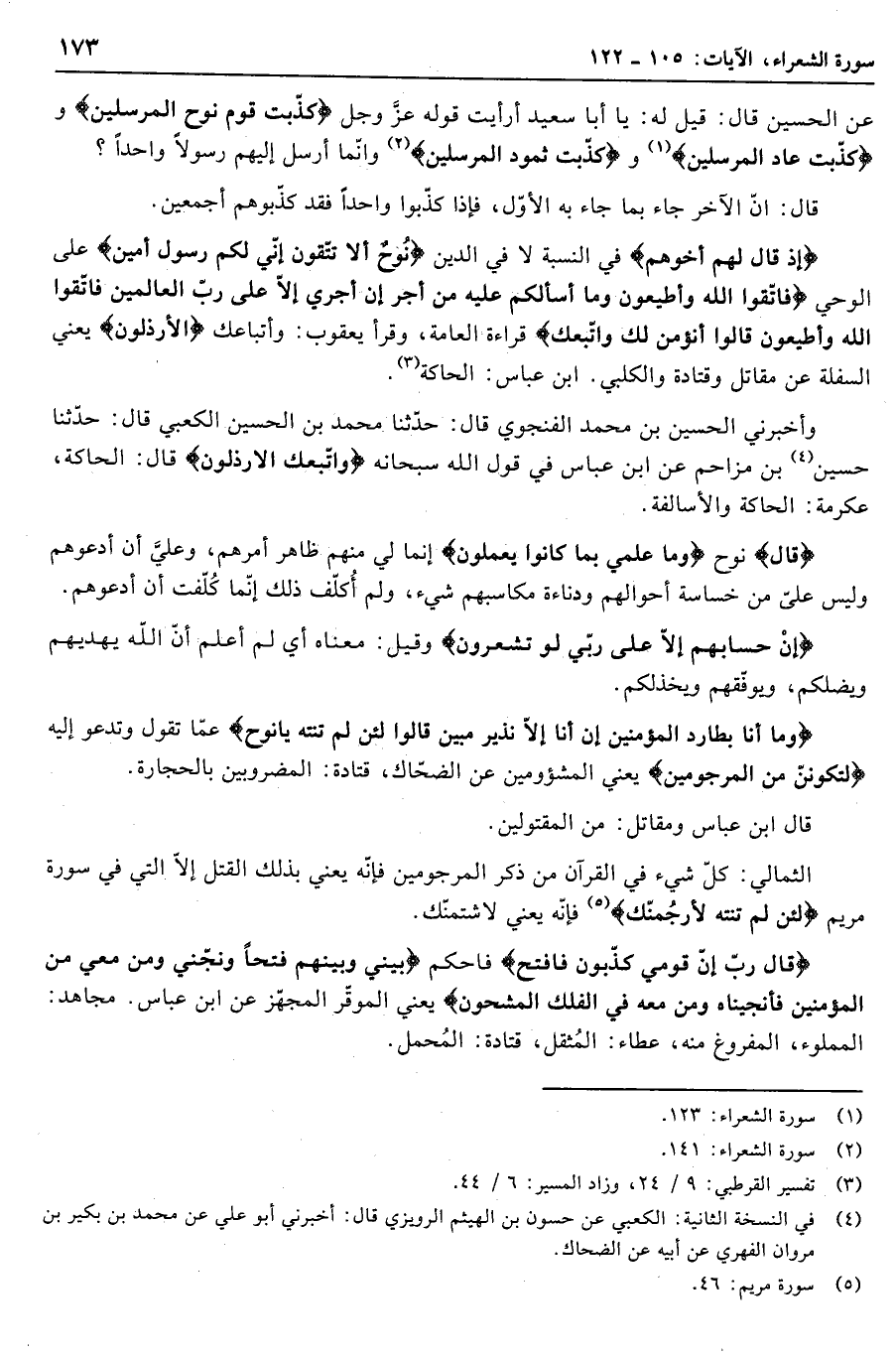 وأخبرني الحسين بن محمد الفنجوي قال: حدّثنا محمد بن الحسين الكعبي قال: حدّثنا حسين «4» بن مزاحم عن ابن عباس في قول الله سبحانه وَاتَّبَعَكَ الْأَرْذَلُونَ قال: الحاكة، عكرمة: الحاكة والأسالفة.
