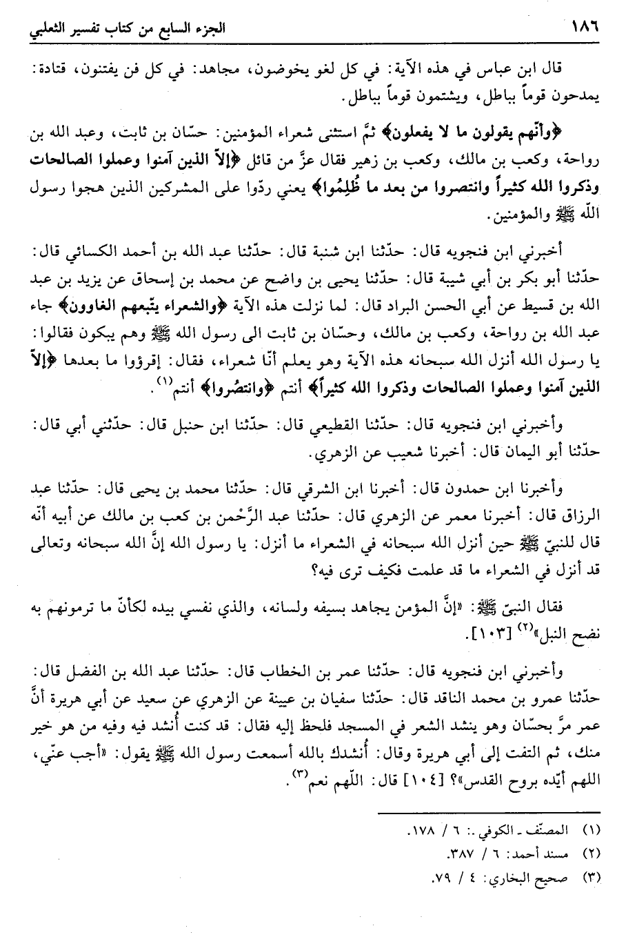 وَأَنَّهُمْ يَقُولُونَ ما لا يَفْعَلُونَ ثمّ استثنى شعراء المؤمنين: حسّان بن ثابت، وعبد الله بن رواحة، وكعب بن مالك، وكعب بن زهير فقال عزّ من قائل إِلَّا الَّذِينَ آمَنُوا وَعَمِلُوا الصَّالِحاتِ وَذَكَرُوا اللَّهَ كَثِيراً وَانْتَصَرُوا مِنْ بَعْدِ ما ظُلِمُوا يعني ردّوا على المشركين الذين هجوا رسول الله صلى الله عليه وسلّم والمؤمنين.