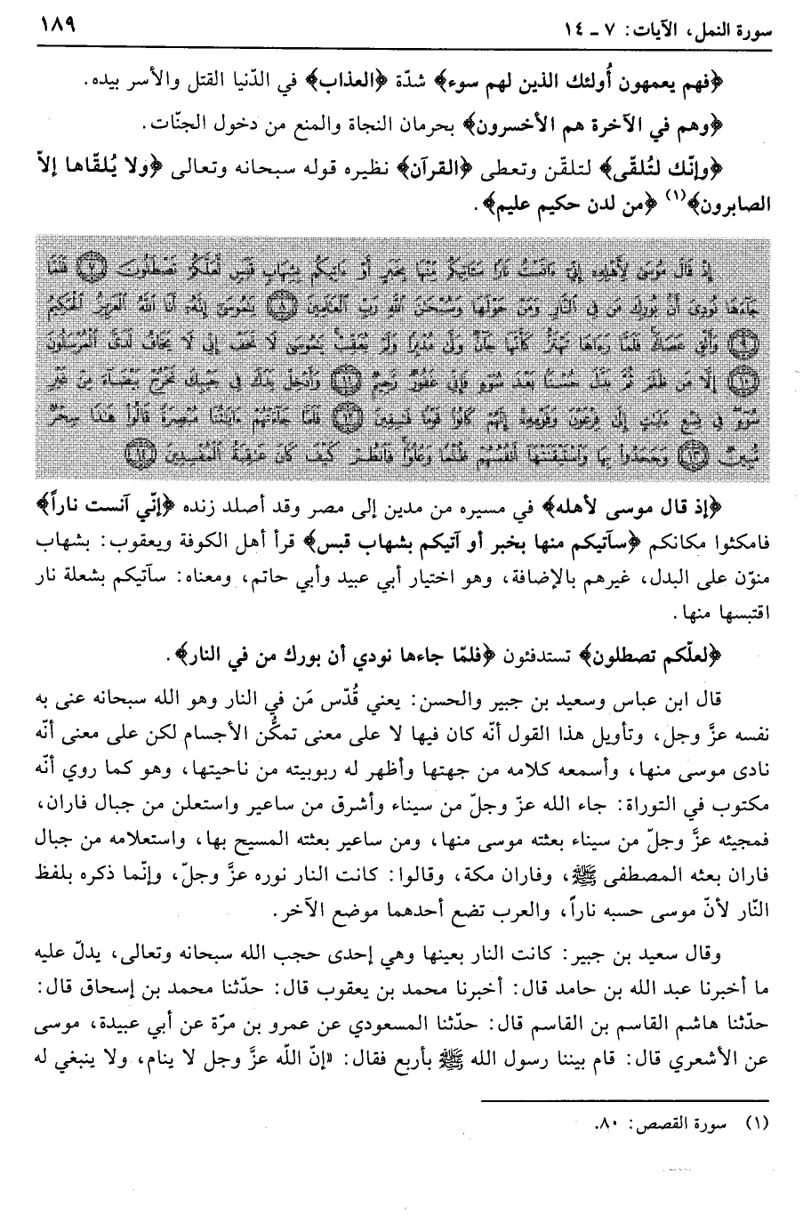 إِذْ قالَ مُوسى لِأَهْلِهِ إِنِّي آنَسْتُ ناراً سَآتِيكُمْ مِنْها بِخَبَرٍ أَوْ آتِيكُمْ بِشِهابٍ قَبَسٍ لَعَلَّكُمْ تَصْطَلُونَ (7) فَلَمَّا جاءَها نُودِيَ أَنْ بُورِكَ مَنْ فِي النَّارِ وَمَنْ حَوْلَها وَسُبْحانَ اللَّهِ رَبِّ الْعالَمِينَ (8) يا مُوسى إِنَّهُ أَنَا اللَّهُ الْعَزِيزُ الْحَكِيمُ (9) وَأَلْقِ عَصاكَ فَلَمَّا رَآها تَهْتَزُّ كَأَنَّها جَانٌّ وَلَّى مُدْبِراً وَلَمْ يُعَقِّبْ يا مُوسى لا تَخَفْ إِنِّي لا يَخافُ لَدَيَّ الْمُرْسَلُونَ (10) إِلاَّ مَنْ ظَلَمَ ثُمَّ بَدَّلَ حُسْناً بَعْدَ سُوءٍ فَإِنِّي غَفُورٌ رَحِيمٌ (11)