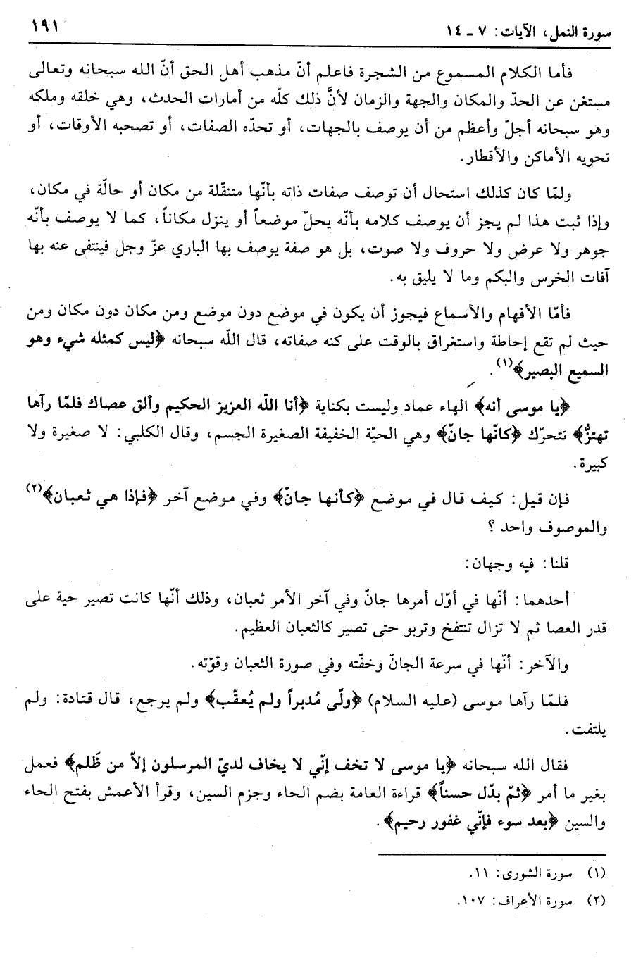 فأما الكلام المسموع من الشجرة فاعلم أنّ مذهب أهل الحق أنّ الله سبحانه وتعالى مستغن عن الحدّ والمكان والجهة والزمان لأنّ ذلك كلّه من أمارات الحدث، وهي خلقه وملكه وهو سبحانه أجلّ وأعظم من أن يوصف بالجهات، أو تحدّه الصفات، أو تصحبه الأوقات، أو تحويه الأماكن والأقطار.