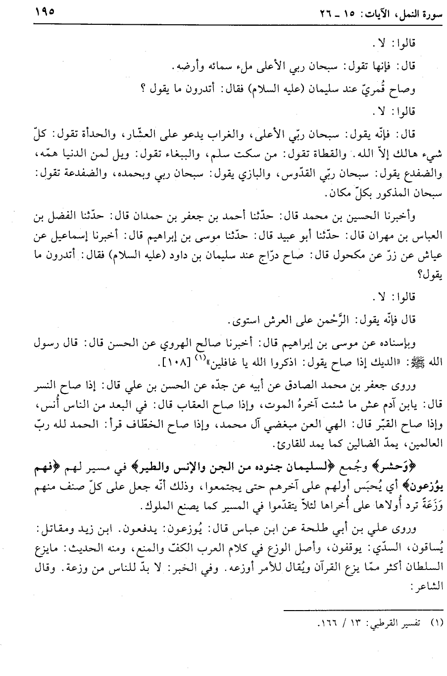 وَحُشِرَ وجمع لِسُلَيْمانَ جُنُودُهُ مِنَ الْجِنِّ وَالْإِنْسِ وَالطَّيْرِ في مسير لهم فَهُمْ يُوزَعُونَ أي يحبس أولهم على آخرهم حتى يجتمعوا، وذلك أنّه جعل على كلّ صنف منهم وزعة ترد أولاها على أخراها لئلّا يتقدّموا في المسير كما يصنع الملوك.