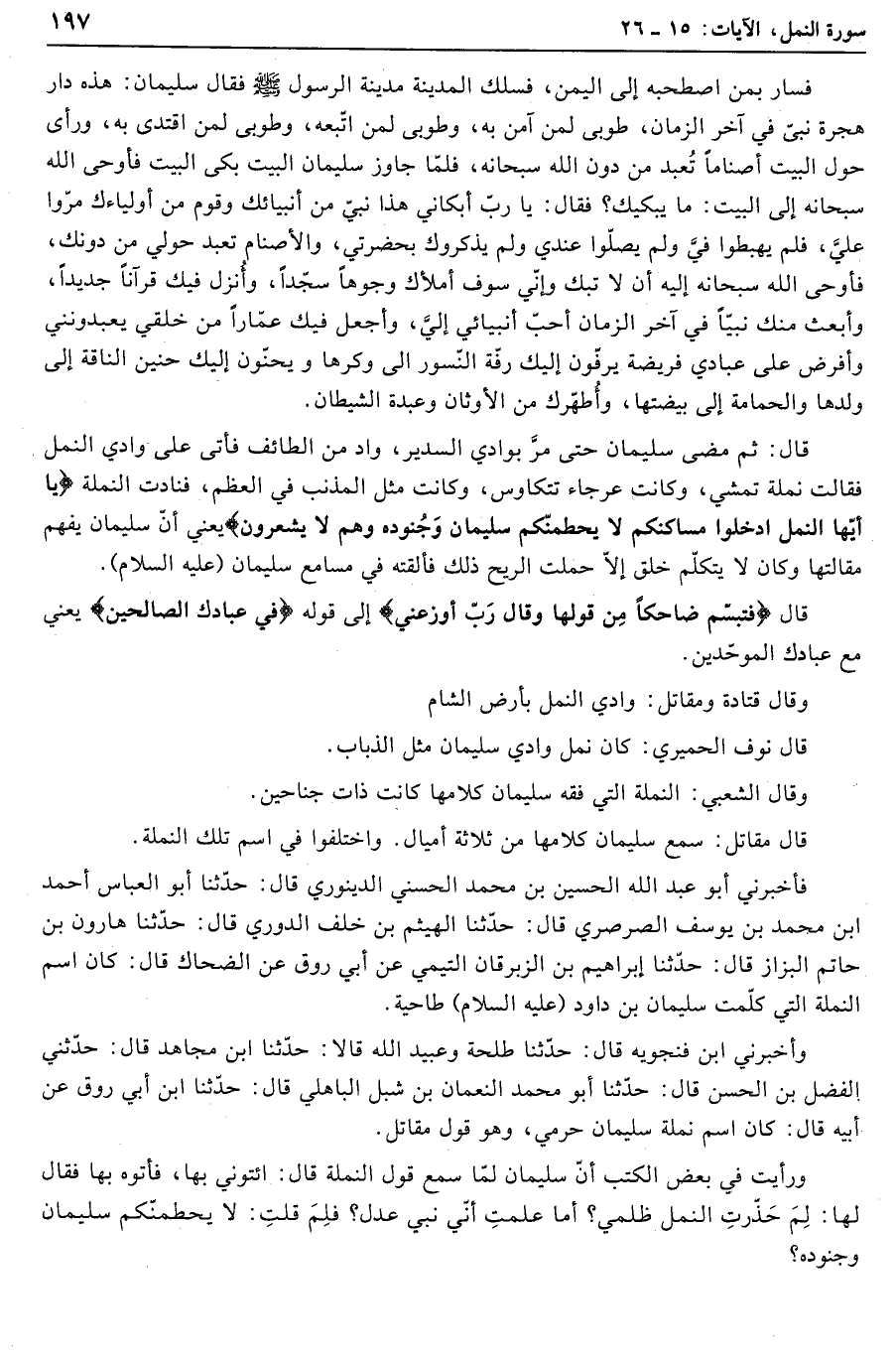 قال: ثم مضى سليمان حتى مرّ بوادي السدير، واد من الطائف فأتى عَلى وادِ النَّمْلِ ف قالَتْ نَمْلَةٌ تمشي، وكانت عرجاء تتكاوس، وكانت مثل المذنب في العظم، فنادت النملة يا أَيُّهَا النَّمْلُ ادْخُلُوا مَساكِنَكُمْ لا يَحْطِمَنَّكُمْ سُلَيْمانُ وَجُنُودُهُ وَهُمْ لا يَشْعُرُونَ يعني أنّ سليمان يفهم مقالتها وكان لا يتكلّم خلق إلّا حملت الريح ذلك فألقته في مسامع سليمان (عليه السلام) .