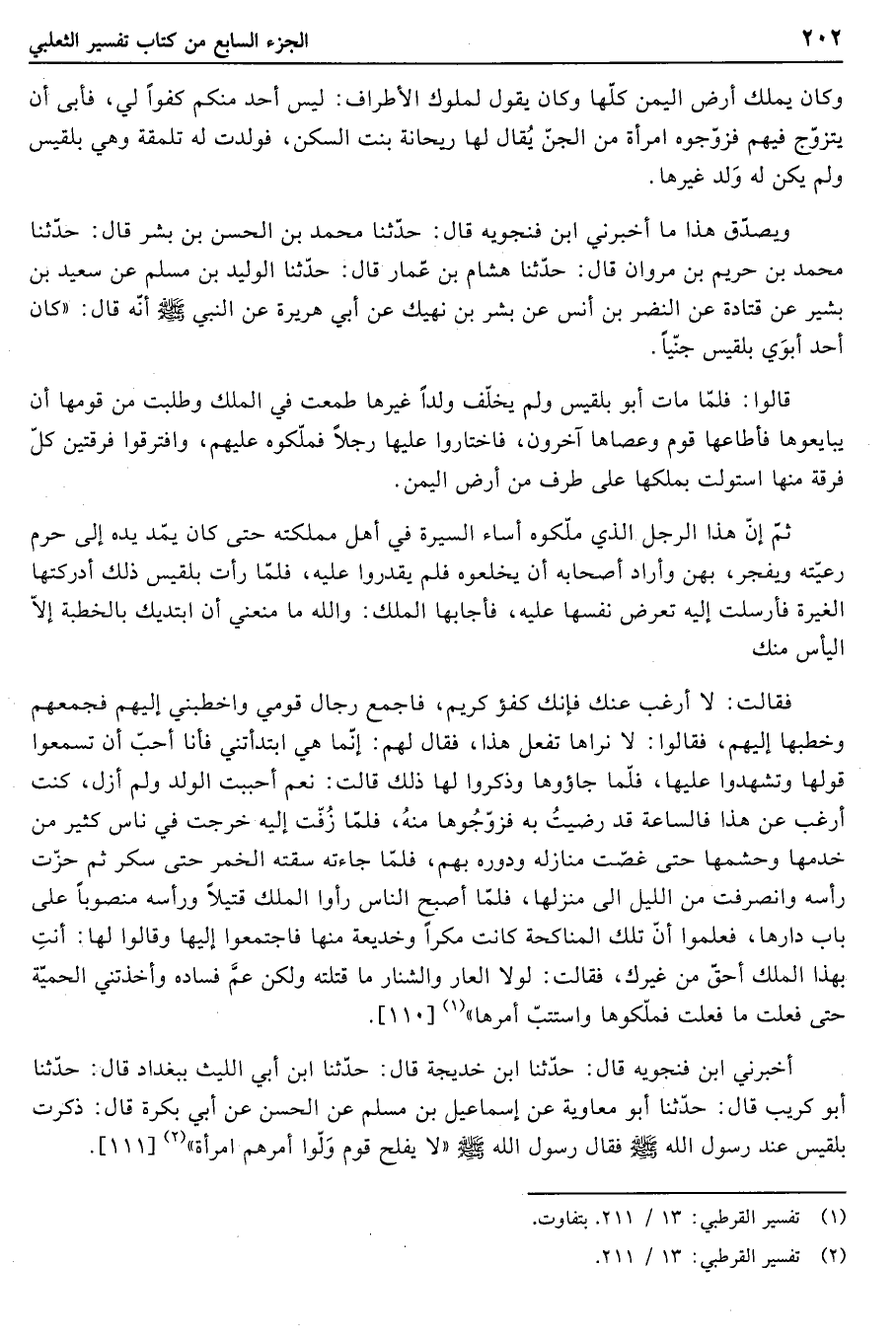 أخبرني ابن فنجويه قال: حدّثنا محمد بن الحسن بن بشر قال: حدّثنا محمد بن حريم بن مروان قال: حدّثنا هشام بن عمّار قال: حدّثنا الوليد بن مسلم عن سعيد بن بشير عن قتادة عن النضر بن أنس عن بشر بن نهيك عن أبي هريرة عن النبي صلى الله عليه وسلّم أنّه قال: «كان أحد أبوي بلقيس جنّيا.