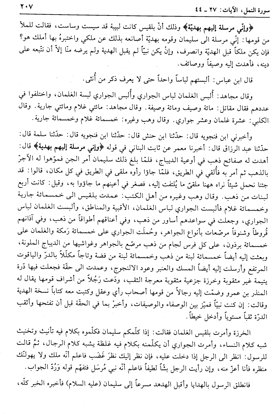 أهدت له صفائح ذهب في أوعية الديباج، فلمّا بلغ ذلك سليمان أمر الجن فموّهوا له الآجرّ بالذهب ثم أمر به فألقي في الطريق، فلمّا جاءوا رأوه ملقى في الطريق في كل مكان، قالوا: قد جئنا نحمل شيئا نراه هاهنا ملقى ما يلتفت إليه، فصغر في أعينهم ما جاءوا به، وقيل: كانت أربع لبنات من ذهب. وقال وهب وغيره من أهل الكتب: عمدت بلقيس الى خمسمائة جارية وخمسمائة غلام فألبست الجواري لباس الغلمان، الأقبية والمناطق، وألبست الغلمان لباس الجواري، وجعلت في سواعدهم أساور من ذهب، وفي أعناقهم أطواقا من ذهب، وفي آذانهم قروطا وشنوفا مرصّعات بأنواع الجواهر، وحملت الجواري على خمسمائة رمكة والغلمان على خمسمائة برذون، على كل فرس لجام من ذهب مرصّع بالجواهر وغواشيها من الديباج الملونة، وبعثت إليه أيضا خمسمائة لبنة من ذهب وخمسمائة لبنة من فضة وتاجا مكلّلا بالدرّ والياقوت المرتفع وأرسلت إليه أيضا المسك والعنبر وعود الألنجوج، وعمدت الى حقّة فجعلت فيها درّة يتيمة غير مثقوبة وخرزة جزعية مثقوبة معرجة الثقب، ودعت رجلا من أشراف قومها يقال له المنذر بن عمرو وضمّت إليه رجالا من قومها أصحاب رأي وعقل وكتبت معه كتابا نسخة الهدية وقالت: إن كنت نبيّا فميّز بين الوصفاء والوصيفات، وأخبر بما في الحقّة قبل أن تفتحها وأثقب الدرّة ثقبا مستويا وأدخل خيطا.