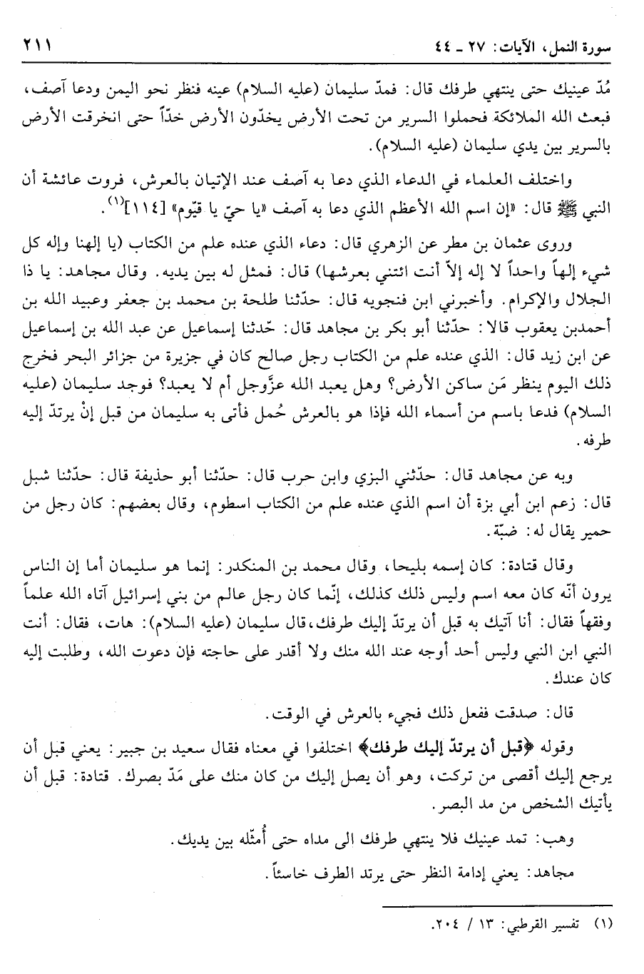 وقوله قَبْلَ أَنْ يَرْتَدَّ إِلَيْكَ طَرْفُكَ اختلفوا في معناه فقال سعيد بن جبير: يعني قبل أن يرجع إليك أقصى من تركت، وهو أن يصل إليك من كان منك على مدّ بصرك. قتادة: قبل أن يأتيك الشخص من مد البصر.
