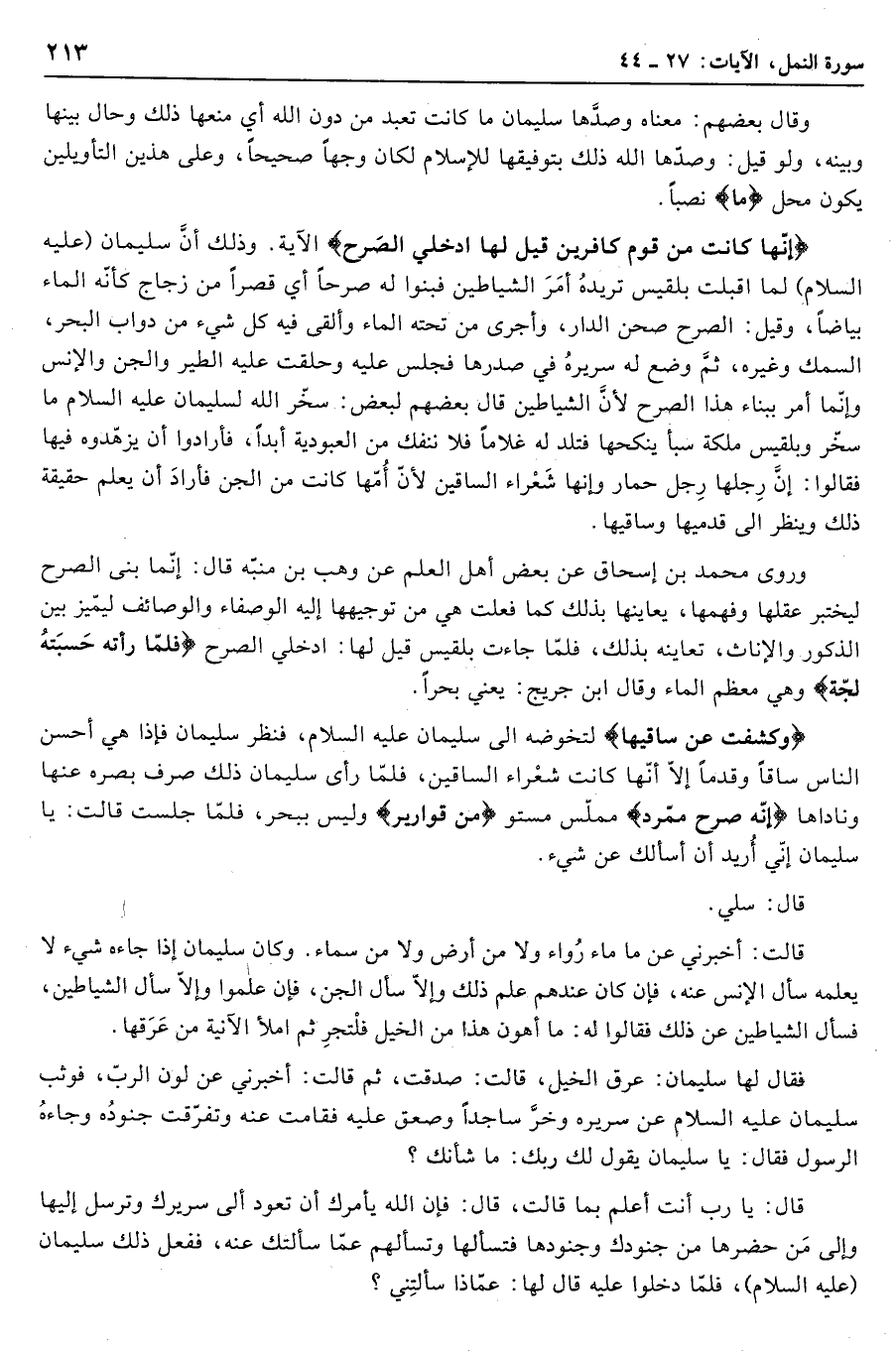 إِنَّها كانَتْ مِنْ قَوْمٍ كافِرِينَ قِيلَ لَهَا ادْخُلِي الصَّرْحَ الآية. وذلك أنّ سليمان (عليه السلام) لما أقبلت بلقيس تريده أمر الشياطين فبنوا له صرحا أي قصرا من زجاج كأنّه الماء بياضا، وقيل: الصرح صحن الدار، وأجرى من تحته الماء وألقى فيه كل شيء من دواب البحر، السمك وغيره، ثمّ وضع له سريره في صدرها فجلس عليه وحلقت عليه الطير والجن والإنس وإنّما أمر ببناء هذا الصرح لأنّ الشياطين قال بعضهم لبعض: سخّر الله لسليمان عليه السلام ما سخّر وبلقيس ملكة سبأ ينكحها فتلد له غلاما فلا ننفك من العبودية أبدا، فأرادوا أن يزهّدوه فيها فقالوا: إنّ رجلها رجل حمار وإنها شعراء الساقين لأنّ أمّها كانت من الجن فأراد أن يعلم حقيقة ذلك وينظر الى قدميها وساقيها.
