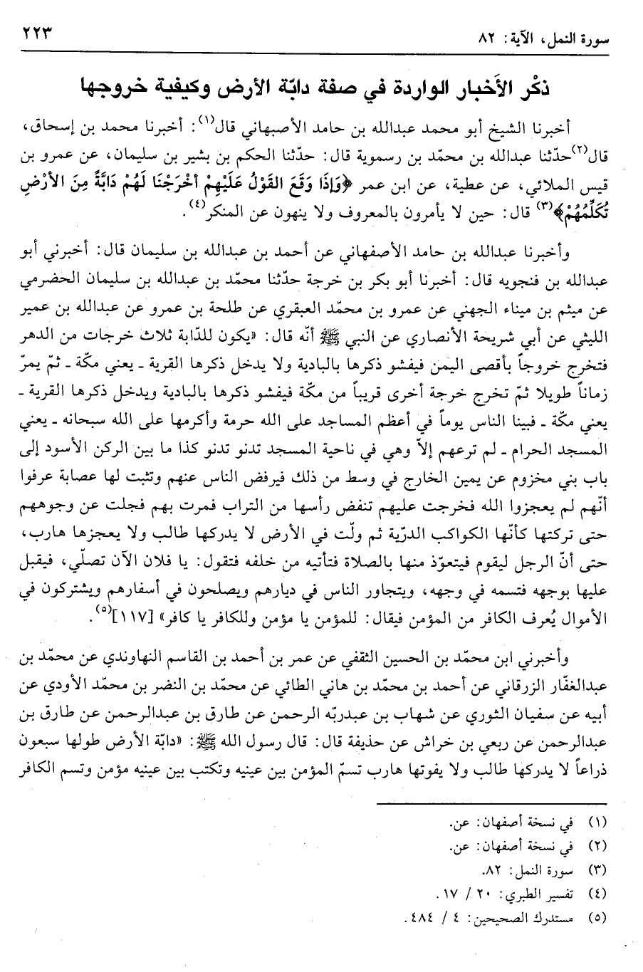 وأخبرني ابن محمّد بن الحسين الثقفي عن عمر بن أحمد بن القاسم النهاوندي عن محمّد بن عبد الغفّار الزرقاني عن أحمد بن محمّد بن هاني الطائي عن محمّد بن النضر بن محمّد الأودي عن أبيه عن سفيان الثوري عن شهاب بن عبد ربّه الرحمن عن طارق بن عبد الرحمن عن طارق بن عبد الرحمن عن ربعي بن خراش عن حذيفة قال: قال رسول الله صلى الله عليه وسلّم: «دابّة الأرض طولها سبعون ذراعا لا يدركها طالب ولا يفوتها هارب تسمّ المؤمن بين عينيه وتكتب بين عينيه مؤمن وتسم الكافر