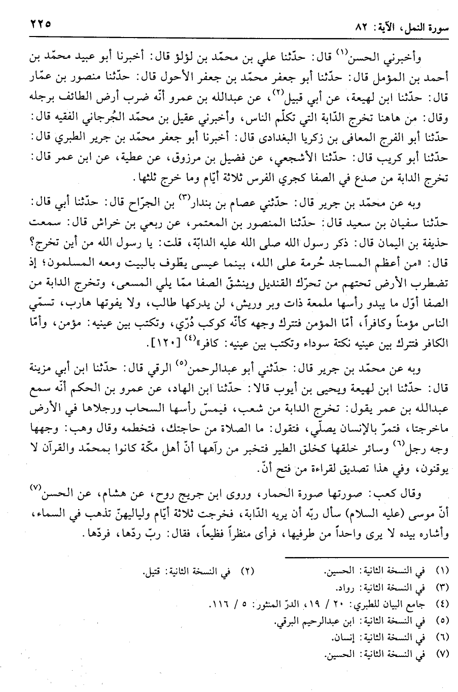 وأخبرني الحسن «1» قال: حدّثنا علي بن محمّد بن لؤلؤ قال: أخبرنا أبو عبيد محمّد بن أحمد بن المؤمل قال: حدّثنا أبو جعفر محمّد بن جعفر الأحول قال: حدّثنا منصور بن عمّار قال: حدّثنا ابن لهيعة، عن أبي قبيل «2» ، عن عبد الله بن عمرو أنّه ضرب أرض الطائف برجله وقال: من هاهنا تخرج الدّابة التي تكلّم الناس، وأخبرني عقيل بن محمّد الجرجاني الفقيه قال: