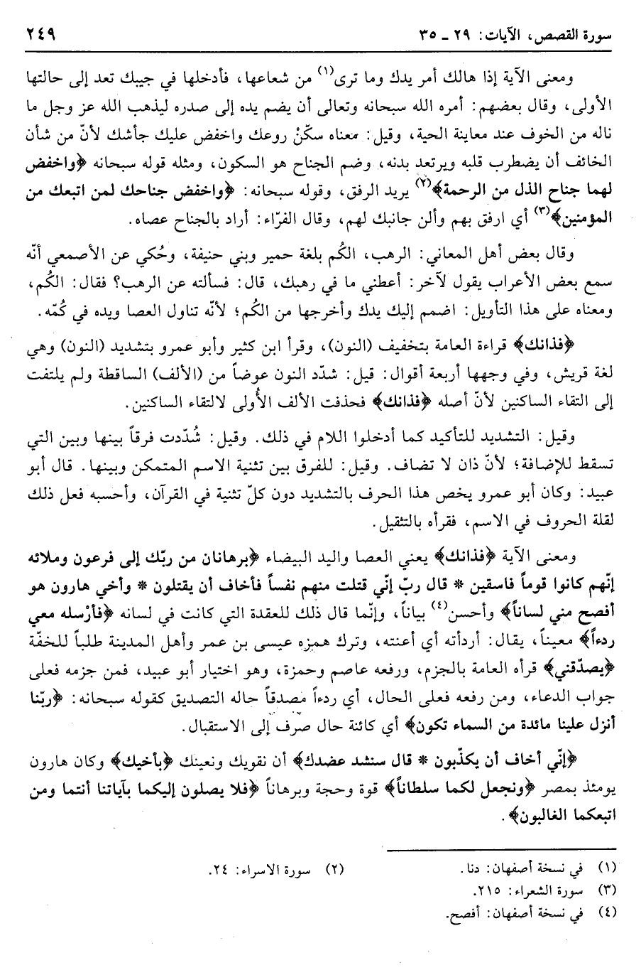 ومعنى الآية إذا هالك أمر يدك وما ترى «1» من شعاعها، فأدخلها في جيبك تعد إلى حالتها الأولى، وقال بعضهم، أمره الله سبحانه وتعالى أن يضم يده إلى صدره ليذهب الله عز وجل ما ناله من الخوف عند معاينة الحية، وقيل: معناه سكّن روعك واخفض عليك جأشك لأنّ من شأن الخائف أن يضطرب قلبه ويرتعد بدنه، وضم الجناح هو السكون، ومثله قوله سبحانه وَاخْفِضْ لَهُما جَناحَ الذُّلِّ مِنَ الرَّحْمَةِ «2» يريد الرفق، وقوله سبحانه: وَاخْفِضْ جَناحَكَ لِمَنِ اتَّبَعَكَ مِنَ الْمُؤْمِنِينَ «3» أي ارفق بهم وألن جانبك لهم، وقال الفرّاء: أراد بالجناح عصاه.