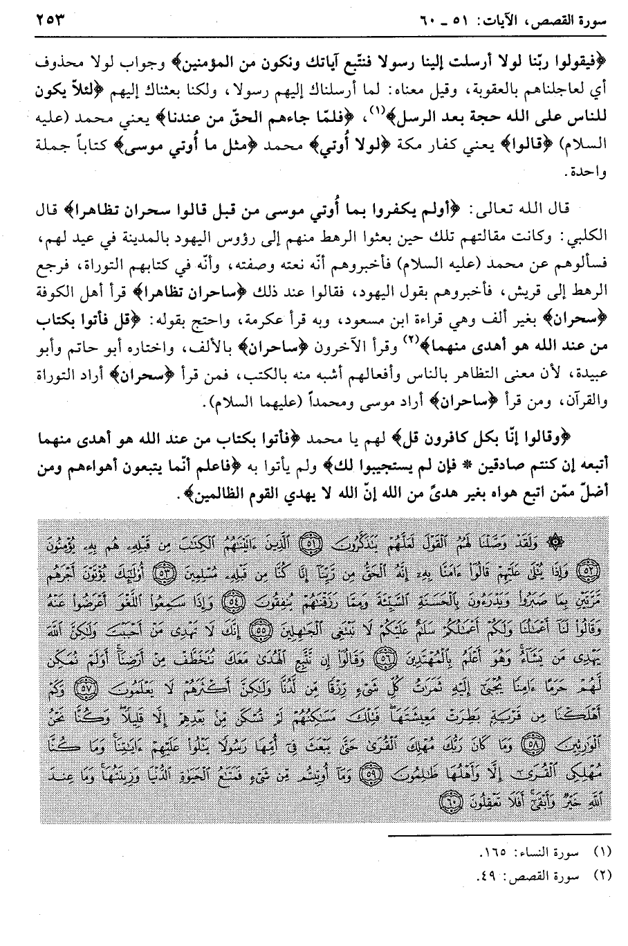 قال الله تعالى: أَوَلَمْ يَكْفُرُوا بِما أُوتِيَ مُوسى مِنْ قَبْلُ قالُوا سِحْرانِ تَظاهَرا قال الكلبي: وكانت مقالتهم تلك حين بعثوا الرهط منهم إلى رؤوس اليهود بالمدينة في عيد لهم، فسألوهم عن محمد (عليه السلام) فأخبروهم أنّه نعته وصفته، وأنّه في كتابهم التوراة، فرجع الرهط إلى قريش، فأخبروهم بقول اليهود، فقالوا عند ذلك ساحران تظاهرا قرأ أهل الكوفة سِحْرانِ بغير ألف وهي قراءة ابن مسعود، وبه قرأ عكرمة، واحتج بقوله: قُلْ فَأْتُوا بِكِتابٍ مِنْ عِنْدِ اللَّهِ هُوَ أَهْدى مِنْهُما «2» وقرأ الآخرون ساحران بالألف، واختاره أبو حاتم وأبو عبيدة، لأن معنى التظاهر بالناس وأفعالهم أشبه منه بالكتب، فمن قرأ سِحْرانِ أراد التوراة والقرآن، ومن قرأ ساحران أراد موسى ومحمدا (عليهما السلام) .