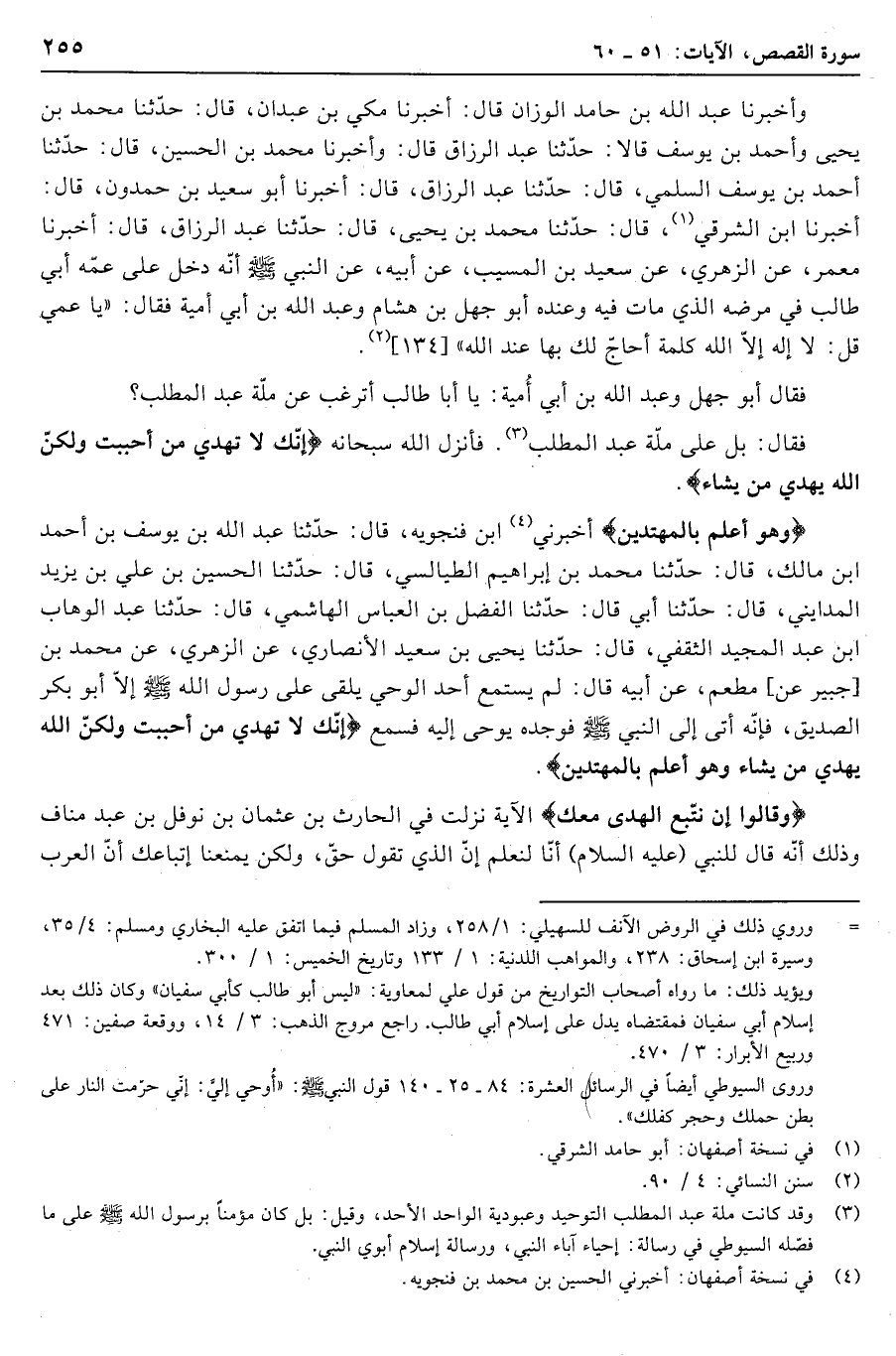 أخبرني «4» ابن فنجويه، قال: حدّثنا عبد الله بن يوسف بن أحمد ابن مالك، قال: حدّثنا محمد بن إبراهيم الطيالسي، قال: حدّثنا الحسين بن علي بن يزيد المدايني، قال: حدّثنا أبي قال: حدّثنا الفضل بن العباس الهاشمي، قال: حدّثنا عبد الوهاب ابن عبد المجيد الثقفي، قال: حدّثنا يحيى بن سعيد الأنصاري، عن الزهري، عن محمد بن [جبير عن] مطعم، عن أبيه قال: لم يستمع أحد الوحي يلقى على رسول الله صلى الله عليه وسلّم إلّا أبو بكر الصديق، فإنّه أتى إلى النبي صلى الله عليه وسلّم فوجده يوحى إليه فسمع إِنَّكَ لا تَهْدِي مَنْ أَحْبَبْتَ وَلكِنَّ اللَّهَ يَهْدِي مَنْ يَشاءُ وَهُوَ أَعْلَمُ بِالْمُهْتَدِينَ.