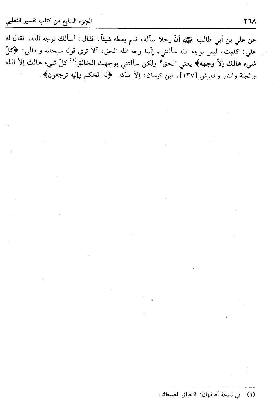 عن علي بن أبي طالب رضي الله عنه أنّ رجلا سأله، فلم يعطه شيئا، فقال: أسألك بوجه الله، فقال له علي: كذبت، ليس بوجه الله سألتني، إنّما وجه الله الحق، ألا ترى قوله سبحانه وتعالى: كُلُّ شَيْءٍ هالِكٌ إِلَّا وَجْهَهُ يعني الحق؟ ولكن سألتني بوجهك الخالق «1» كلّ شيء هالك إلّا الله والجنة والنار والعرش [137] .