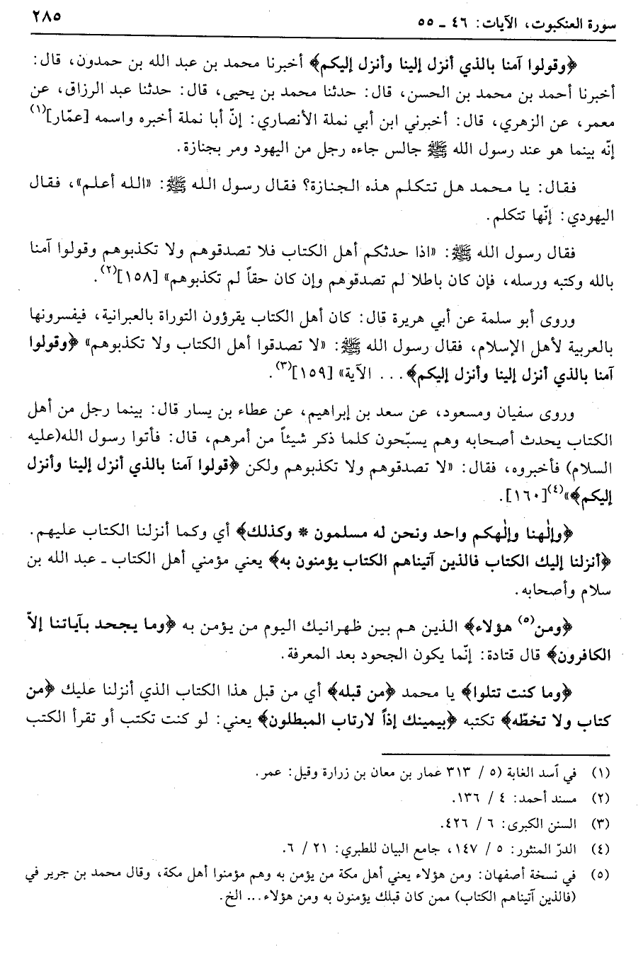 وروى سفيان ومسعود، عن سعد بن إبراهيم، عن عطاء بن يسار قال: بينما رجل من أهل الكتاب يحدث أصحابه وهم يسبّحون كلما ذكر شيئا من أمرهم، قال: فأتوا رسول الله (عليه السلام) فأخبروه، فقال: «لا تصدقوهم ولا تكذبوهم ولكن قُولُوا آمَنَّا بِالَّذِي أُنْزِلَ إِلَيْنا وَأُنْزِلَ إِلَيْكُمْ «4» [160] .