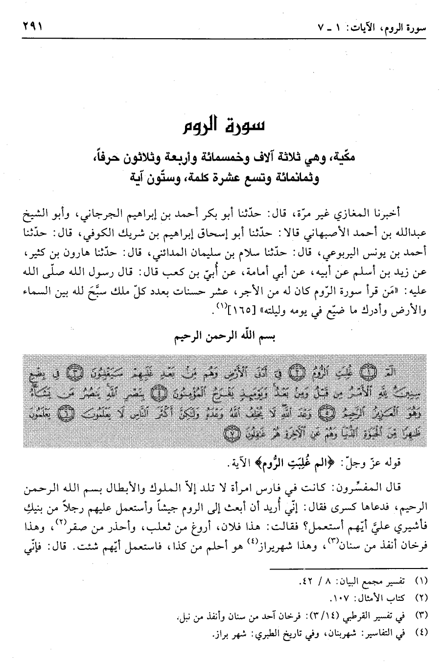 الم (1) غُلِبَتِ الرُّومُ (2) فِي أَدْنَى الْأَرْضِ وَهُمْ مِنْ بَعْدِ غَلَبِهِمْ سَيَغْلِبُونَ (3) فِي بِضْعِ سِنِينَ لِلَّهِ الْأَمْرُ مِنْ قَبْلُ وَمِنْ بَعْدُ وَيَوْمَئِذٍ يَفْرَحُ الْمُؤْمِنُونَ (4)