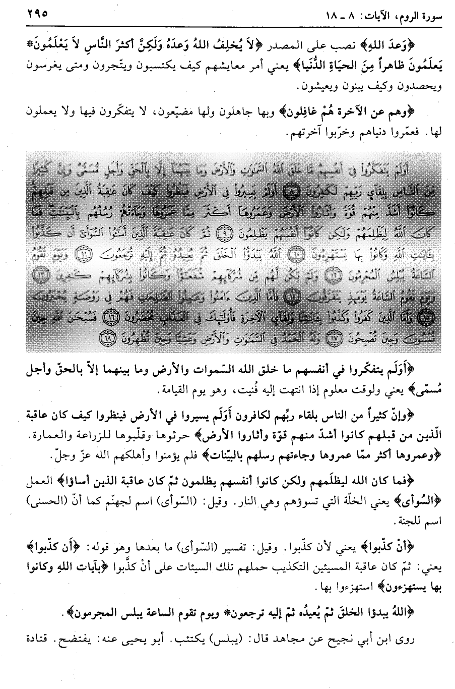 أَوَلَمْ يَتَفَكَّرُوا فِي أَنْفُسِهِمْ ما خَلَقَ اللَّهُ السَّماواتِ وَالْأَرْضَ وَما بَيْنَهُما إِلاَّ بِالْحَقِّ وَأَجَلٍ مُسَمًّى وَإِنَّ كَثِيراً مِنَ النَّاسِ بِلِقاءِ رَبِّهِمْ لَكافِرُونَ (8) أَوَلَمْ يَسِيرُوا فِي الْأَرْضِ فَيَنْظُرُوا كَيْفَ كانَ عاقِبَةُ الَّذِينَ مِنْ قَبْلِهِمْ كانُوا أَشَدَّ مِنْهُمْ قُوَّةً وَأَثارُوا الْأَرْضَ وَعَمَرُوها أَكْثَرَ مِمَّا عَمَرُوها وَجاءَتْهُمْ رُسُلُهُمْ بِالْبَيِّناتِ فَما كانَ اللَّهُ لِيَظْلِمَهُمْ وَلكِنْ كانُوا أَنْفُسَهُمْ يَظْلِمُونَ (9) ثُمَّ كانَ عاقِبَةَ الَّذِينَ أَساؤُا السُّواى أَنْ كَذَّبُوا بِآياتِ اللَّهِ وَكانُوا بِها يَسْتَهْزِؤُنَ (10) اللَّهُ يَبْدَؤُا الْخَلْقَ ثُمَّ يُعِيدُهُ ثُمَّ إِلَيْهِ تُرْجَعُونَ (11) وَيَوْمَ تَقُومُ السَّاعَةُ يُبْلِسُ الْمُجْرِمُونَ (12)