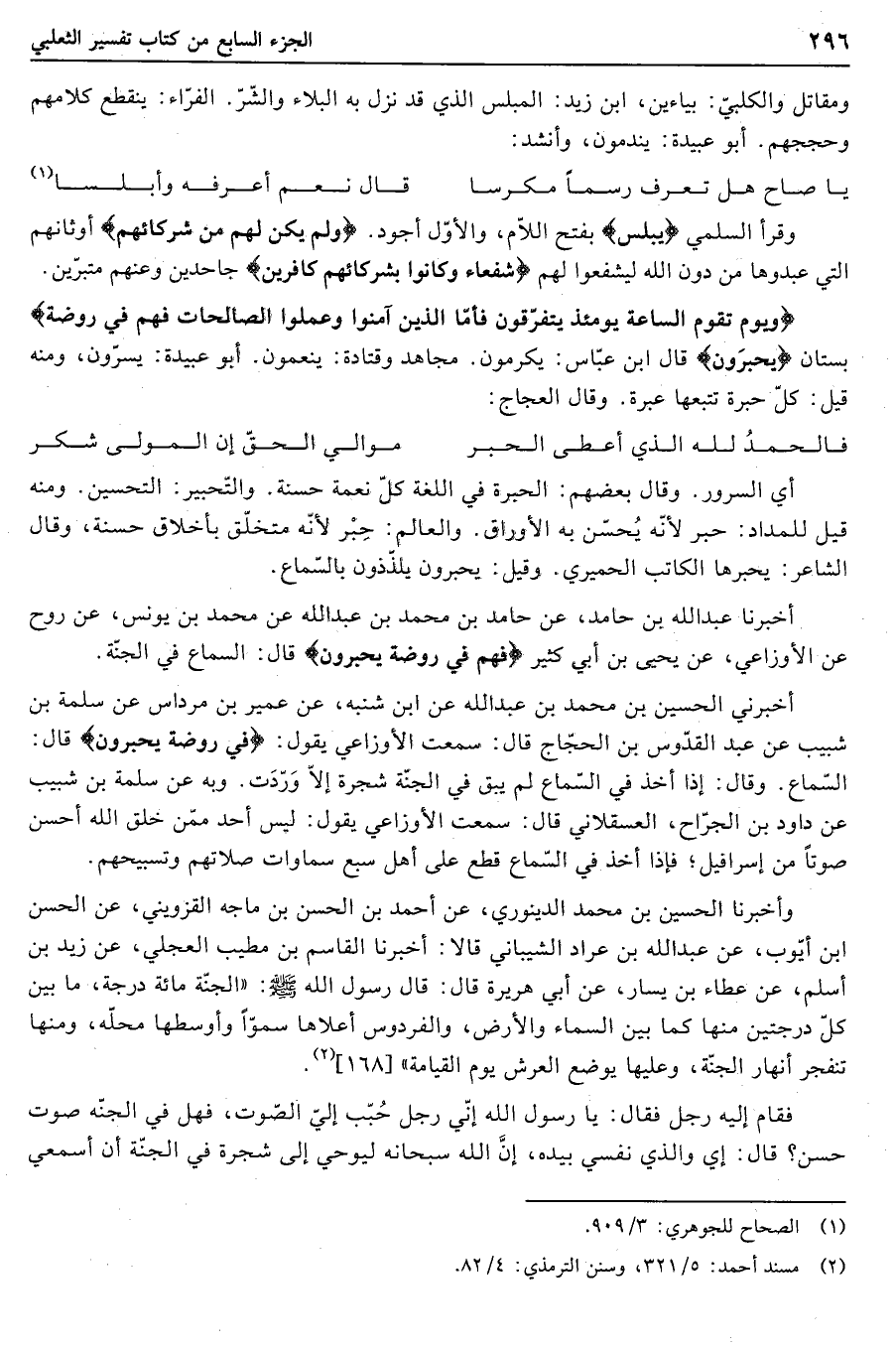 أخبرني الحسين بن محمد بن عبد الله عن ابن شنبه، عن عمير بن مرداس عن سلمة بن شبيب عن عبد القدّوس بن الحجّاج قال: سمعت الأوزاعي يقول: فِي رَوْضَةٍ يُحْبَرُونَ قال: