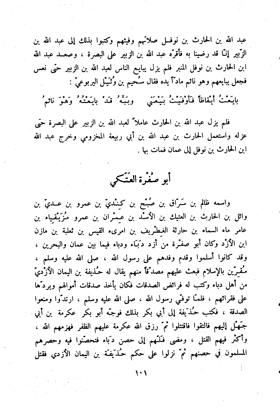 عَبْدَ اللَّهِ بْنَ الْحَارِثِ بْنِ نَوْفَلٍ صَلَاتَهُمْ وَفَيْئَهُمْ، وَكَتَبُوا بِذَلِكَ إِلَى عَبْدِ اللَّهِ بْنِ الزُّبَيْرِ إِنَّا قَدْ رَضِينَا بِهِ، فَأَقَرَّهُ عَبْدُ اللَّهِ بْنُ الزُّبَيْرِ عَلَى الْبَصْرَةِ، وَصَعِدَ عَبْدُ اللَّهِ بْنُ الْحَارِثِ بْنِ نَوْفَلٍ الْمِنْبَرَ، فَلَمْ يَزَلْ يُبَايِعُ النَّاسَ لِعَبْدِ اللَّهِ بْنِ الزُّبَيْرِ حَتَّى نَعَسَ، فَجَعَلَ يُبَايِعُهُمْ وَهُوَ نَائِمٌ مَادًّا يَدَهُ، فَقَالَ سُحَيْمُ بْنُ وُثَيْلٍ الْيَرْبُوعِيُّ: