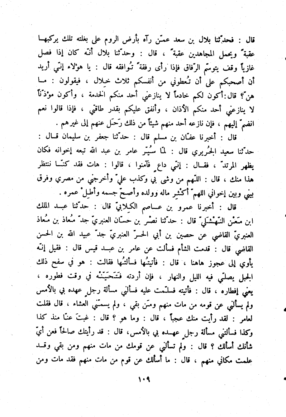 قَالَ: أَخْبَرَنَا عَمْرُو بْنُ عَاصِمٍ الْكِلَابِيُّ قَالَ: حَدَّثَنَا عَبْدُ الْمَلِكِ بْنُ مَعْنٍ النَّهْشَلِيُّ قَالَ: حَدَّثَنَا نَصْرُ بْنُ حَسَّانَ الْعَنْبَرِيُّ جَدُّ مُعَاذِ بْنِ مُعَاذٍ الْعَنْبَرِيِّ الْقَاضِي، عَنْ حُصَيْنِ بْنِ أَبِي الْحَرِّ الْعَنْبَرِيِّ جَدِّ عُبَيْدِ اللَّهِ بْنِ الْحَسَنِ الْقَاضِي قَالَ: قَدِمْتُ الشَّامَ، فَسَأَلْتُ عَنْ عَامِرِ بْنِ عَبْدِ قَيْسٍ قَالَ: فَقِيلَ: إِنَّهُ يَأْوِي إِلَى عَجُوزٍ هَاهُنَا قَالَ: فَأَتَيْتُهَا، فَسَأَلْتُهَا، فَقَالَتْ: هُوَ فِي سَفْحِ ذَلِكَ الْجَبَلِ يُصَلِّي فِيهِ اللَّيْلَ وَالنَّهَارَ، فَإِنْ أَرَدْتَهُ، فَتَحَيَّنْهُ فِي وَقْتِ فُطُورِهِ يَعْنِي إِفْطَارَهُ قَالَ: فَأَتَيْتُهُ، فَسَلَّمْتُ عَلَيْهِ، فَسَأَلَنِي مَسْأَلَةَ رَجُلٍ عَهْدُهُ بِي بِالْأَمْسِ، وَلَمْ يَسْأَلْنِي عَنْ قَوْمِهِ مَنْ مَاتَ مِنْهُمْ، وَمَنْ بَقِيَ، وَلَمْ يُسَمِّنِي الْعَشَاءَ قَالَ: فَقُلْتُ لِعَامِرٍ: لَقَدْ رَأَيْتُ مِنْكَ عَجَبًا قَالَ: «وَمَا هُوَ؟» قَالَ: غِبْتَ عَنَّا مُنْذُ كَذَا وَكَذَا، فَسَأَلَتْنِي مَسْأَلَةَ رَجُلٍ عَهْدُهُ بِي بِالْأَمْسِ قَالَ: «قَدْ رَأَيْتُك صَالِحًا، فَعَنْ أَيِّ شَأْنِكَ أَسْأَلُكَ» قَالَ: وَلَمْ تَسْأَلْنِي عَنْ قَوْمِكَ، مَنْ مَاتَ مِنْهُمْ، وَمَنْ بَقِيَ، وَقَدْ عَلِمْتَ مَكَانِي مِنْهُمْ " قَالَ: «مَا أَسْأَلُكَ عَنْ قَوْمٍ، مَنْ مَاتَ مِنْهُمْ فَقَدْ مَاتَ، وَمَنْ
