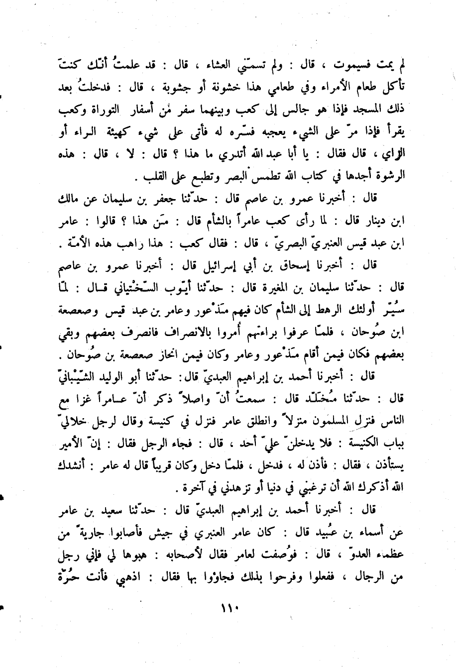 قَالَ: أَخْبَرَنَا عَمْرُو بْنُ عَاصِمٍ قَالَ: حَدَّثَنَا جَعْفَرُ بْنُ سُلَيْمَانَ، عَنْ مَالِكِ بْنِ دِينَارٍ قَالَ: لَمَّا رَأَى كَعْبٌ عَامِرًا بِالشَّامِ قَالَ: «مَنْ هَذَا؟» قَالُوا: عَامِرُ بْنُ عَبْدِ قَيْسٍ الْعَنْبَرِيُّ الْبَصْرِيُّ قَالَ: فَقَالَ كَعْبٌ: «§هَذَا رَاهِبُ هَذِهِ الْأُمَّةِ»