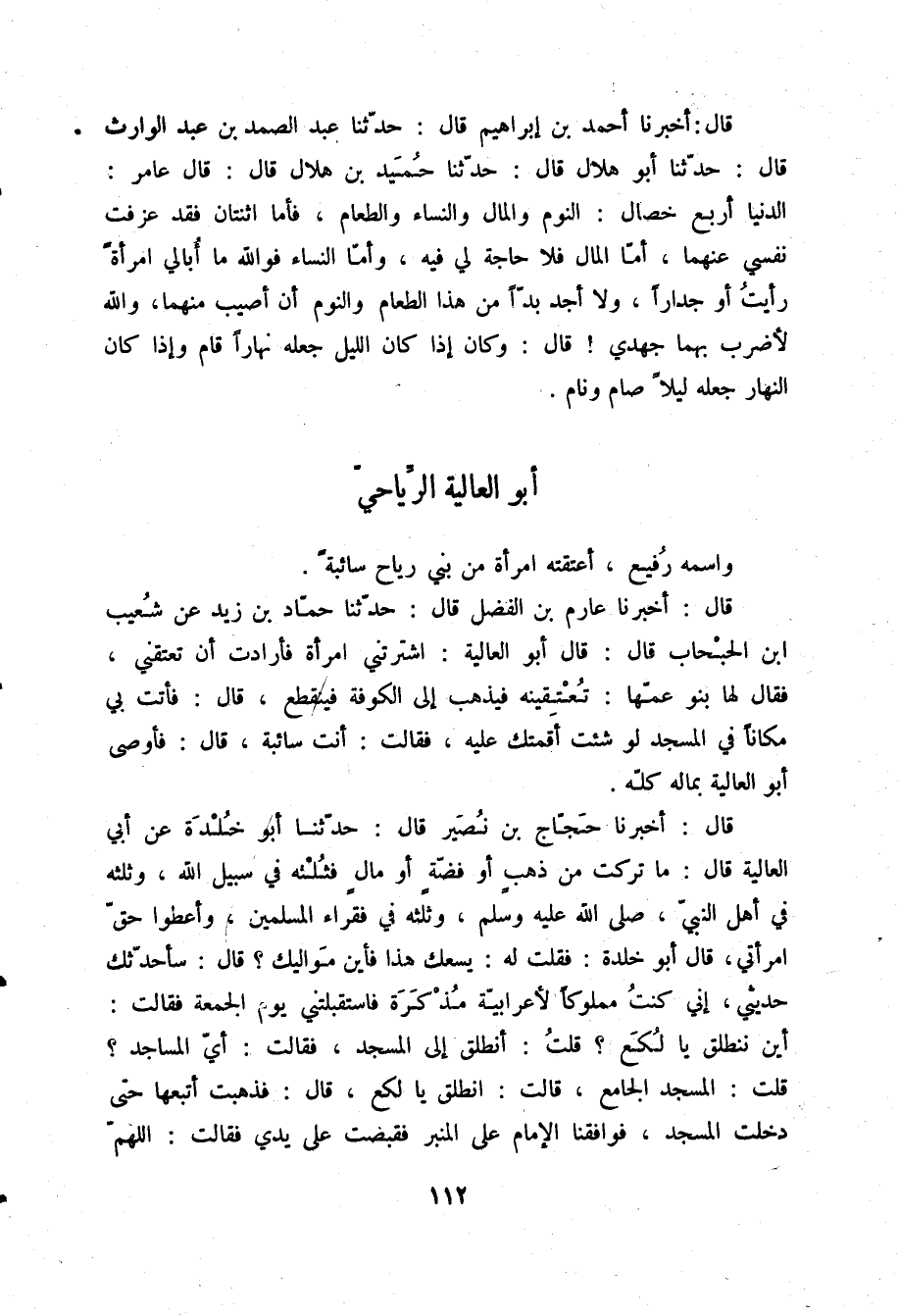 قَالَ: أَخْبَرَنَا حَجَّاجُ بْنُ نُصَيْرٍ قَالَ: حَدَّثَنَا أَبُو خَلْدَةَ، عَنْ أَبِي الْعَالِيَةِ قَالَ: «§مَا تَرَكْتُ مِنْ ذَهَبٍ، أَوْ فِضَّةٍ، أَوْ مَالٍ فَثُلُثُهُ فِي سَبِيلِ اللَّهِ، وَثُلُثُهُ فِي أَهْلِ النَّبِيِّ صلّى الله عليه وسلم، وَثُلُثُهُ فِي فُقَرَاءِ الْمُسْلِمِينَ، وَأَعْطُوا حَقَّ امْرَأَتِي» قَالَ أَبُو خَلْدَةَ: فَقُلْتُ لَهُ: يَسَعُكَ هَذَا، فَأَيْنَ مَوَالِيكَ؟ قَالَ: " سَأُحَدِّثُكَ حَدِيثِي: إِنِّي كُنْتُ مَمْلُوكًا لِأَعْرَابِيَّةٍ مُذْكَرَةٍ، فَاسْتَقْبَلَتْنِي يَوْمَ الْجُمُعَةِ، فَقَالَتْ: أَيْنَ نَنْطَلِقُ يَا لُكَعُ؟ قُلْتُ: أَنْطَلِقُ إِلَى الْمَسْجِدِ فَقَالَتْ: أَيُّ الْمَسَاجِدِ؟ قُلْتُ: الْمَسْجِدُ الْجَامِعُ قَالَتْ: انْطَلِقْ يَا لُكَعُ قَالَ: فَذَهَبْتُ أَتْبَعُهَا حَتَّى دَخَلَتِ الْمَسْجِدَ، فَوَافَقْنَا الْإِمَامَ عَلَى الْمِنْبَرِ، فَقَبَضَتْ عَلَى يَدِي، فَقَالَتْ: اللَّهُمَّ -[113]- اذْخَرَهُ عِنْدَكَ ذَخِيرَةً، اشْهَدُوا يَا أَهْلَ الْمَسْجِدِ، إِنَّهُ سَائِبَةٌ لِلَّهِ، لَيْسَ لِأَحَدٍ عَلَيْهِ سَبِيلٌ إِلَّا سَبِيلَ مَعْرُوفٍ " قَالَ: «فَتَرَكَتْنِي، وَذَهَبَتْ» قَالَ: «فَمَا تَرَاءَيْنَا بَعْدُ» ، قَالَ أَبُو الْعَالِيَةِ وَالسَّائِبَةُ يَضَعُ نَفْسَهُ حَيْثُ يَشَاءُ