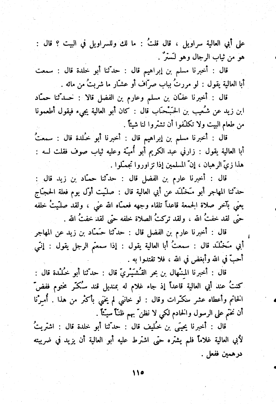 قَالَ: أَخْبَرَنَا مُسْلِمُ بْنُ إِبْرَاهِيمَ قَالَ: أَخْبَرَنَا أَبُو خَلْدَةَ قَالَ: سَمِعْتُ أَبَا الْعَالِيَةِ يَقُولُ: " §زَارَنِي عَبْدُ الْكَرِيمِ أَبُو أُمَيَّةَ وَعَلَيْهِ ثِيَابُ صُوفٍ، فَقُلْتُ لَهُ: هَذَا زِيُّ الرُّهْبَانِ، إِنَّ الْمُسْلِمِينَ إِذَا تَزَاوَرُوا تَجَمَّلُوا "
