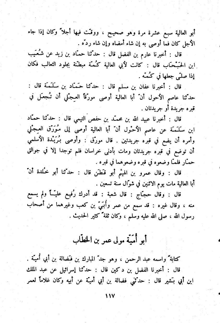 قَالَ: أَخْبَرَنَا عُبَيْدُ اللَّهِ بْنُ مُحَمَّدِ بْنِ حَفْصٍ التَّيْمِيُّ قَالَ: حَدَّثَنَا حَمَّادُ بْنُ سَلَمَةَ، عَنْ عَاصِمٍ الْأَحْوَلِ أَنَّ أَبَا الْعَالِيَةِ «أَوْصَى إِلَى مُوَرِّقٍ الْعِجْلِيِّ، §وَأَمَرَهُ أَنْ يَضَعَ فِي قَبْرِهِ جَرِيدَتَيْنِ» قَالَ مُوَرِّقٌ: «وَأَوْصَى بُرَيْدَةُ الْأَسْلَمِيُّ أَنْ تُوضَعَ فِي قَبْرِهِ جَرِيدَتَانِ، وَمَاتَ بِأَدْنَى خُرَاسَانَ، فَلَمْ تُوجَدَا إِلَّا فِي جَوَالِقِ حَمَّارٍ، فَلَمَّا وَضَعُوهُ فِي قَبْرِهِ وَضَعُوهُمَا فِي قَبْرِهِ» قَالَ: وَقَالَ عَمْرُو بْنُ الْهَيْثَمِ أَبُو قَطَنٍ قَالَ: حَدَّثَنَا أَبُو خَلْدَةَ «أَنَّ أَبَا الْعَالِيَةِ مَاتَ يَوْمَ الِاثْنَيْنِ فِي شَوَّالٍ سَنَةَ تِسْعِينَ» قَالَ: وَقَالَ حَجَّاجٌ: قَالَ شُعْبَةُ: «قَدْ أَدْرَكَ رُفَيْعٌ عَلِيًّا، وَلَمْ يَسْمَعْ مِنْهُ» وَقَالَ غَيْرُهُ: «قَدْ سَمِعَ مِنَ عُمَرَ، وَأُبَيِّ بْنِ كَعْبٍ، وَغَيْرِهِمَا مِنْ أَصْحَابِ رَسُولِ اللَّهِ صلّى الله عليه وسلم، وَكَانَ ثِقَةً كَثِيرَ الْحَدِيثِ»