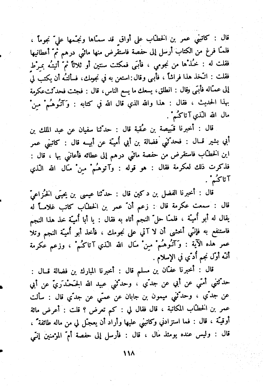 قَالَ: أَخْبَرَنَا قَبِيصَةُ بْنُ عُقْبَةَ قَالَ: حَدَّثَنَا سُفْيَانُ، عَنْ عَبْدِ الْمَلِكِ بْنِ أَبِي بَشِيرٍ قَالَ: فَحَدَّثَنِي فَضَالَةُ بْنُ أَبِي أُمَيَّةَ، عَنْ أَبِيهِ قَالَ: «§كَاتَبَنِي عُمَرُ بْنُ الْخَطَّابِ، فَاسْتَقْرَضَ مِنْ حَفْصَةَ مِائَتَيْ دِرْهَمٍ إِلَى عَطَائِهِ، فَأَعَانَنِي بِهَا» قَالَ: فَذَكَرْتُ ذَلِكَ لِعِكْرِمَةَ، فَقَالَ: هُوَ قَوْلُهُ: {وَآتُوهُمْ مِنْ مَالِ اللَّهِ الَّذِي آتَاكُمْ} [النور: 33]