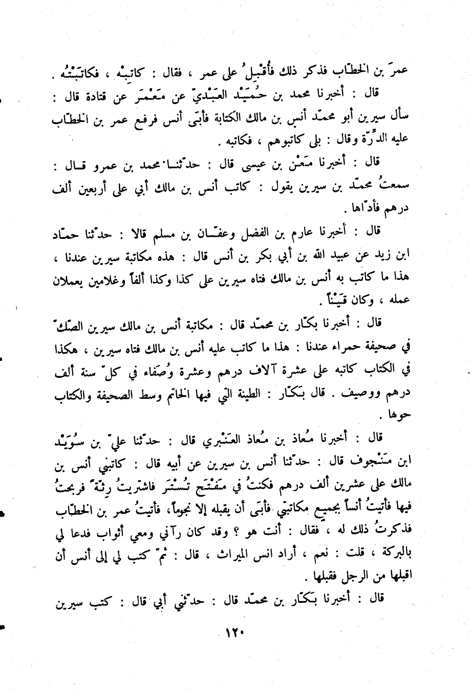 قَالَ: أَخْبَرَنَا بَكَّارُ بْنُ مُحَمَّدٍ قَالَ: مُكَاتَبَةُ أَنَسِ بْنِ مَالِكٍ سِيرِينَ، الصَّكُّ فِي صَحِيفَةٍ حَمْرَاءَ عِنْدَنَا: «هَذَا §مَا كَاتَبَ عَلَيْهِ أَنَسُ بْنُ مَالِكٍ فَتَاهُ سِيرِينَ، هَكَذَا فِي الْكِتَابِ كَاتَبَهُ عَلَى عَشَرَةِ آلَافِ دِرْهَمٍ، وَعَشَرَةِ وُصَفَاءَ، فِي كُلِّ سَنَةٍ أَلْفُ دِرْهَمٍ وَوَصِيفٌ» قَالَ بَكَّارٌ: الطِّينَةُ الَّتِي فِيهَا الْخَاتَمُ وَسَطَ الصَّحِيفَةِ، وَالْكِتَابُ حَوْلَهَا
