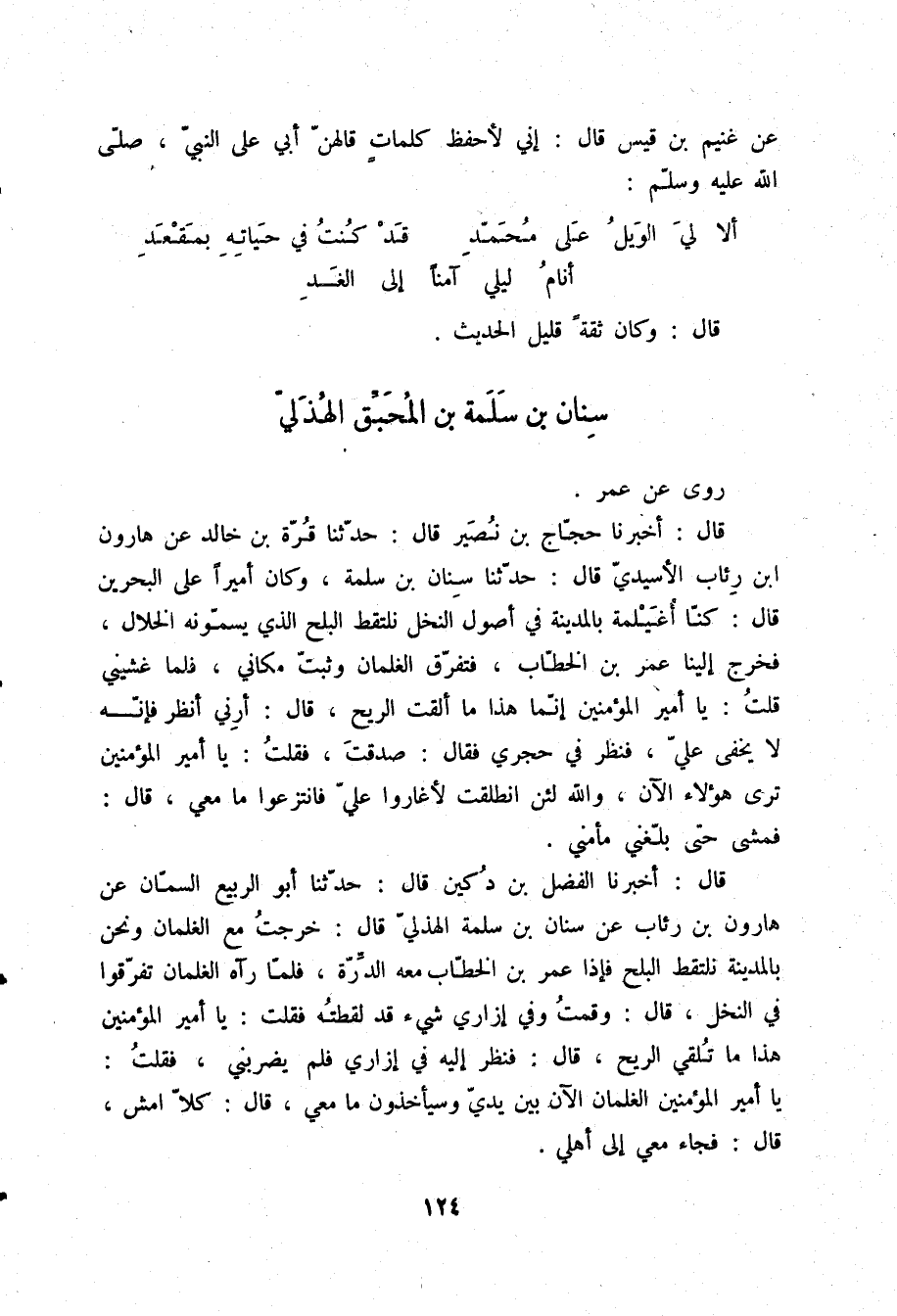 قَالَ: أَخْبَرَنَا الْفَضْلُ بْنُ دُكَيْنٍ قَالَ: حَدَّثَنَا أَبُو الرَّبِيعِ السَّمَّانُ، عَنْ هَارُونَ بْنِ رِئَابٍ، عَنْ سِنَانِ بْنِ سَلَمَةَ الْهُذَلِيِّ قَالَ: §خَرَجْتُ مَعَ الْغِلْمَانِ وَنَحْنُ بِالْمَدِينَةِ نَلْتَقِطُ الْبَلَحَ، فَإِذَا عُمَرُ بْنُ الْخَطَّابِ مَعَهُ الدِّرَّةُ، فَلَمَّا رَآهُ الْغِلْمَانُ تَفَرَّقُوا فِي النَّخْلِ قَالَ: وَقُمْتُ وَفِي إِزَارِي شَيْءٌ قَدْ لَقَطْتُهُ، فَقُلْتُ: يَا أَمِيرَ الْمُؤْمِنِينَ، هَذَا مَا تُلْقِي الرِّيحُ، قَالَ: فَنَظَرَ إِلَيْهِ فِي إِزَارِي، فَلَمْ يَضْرِبْنِي، فَقُلْتُ: يَا أَمِيرَ الْمُؤْمِنِينَ، الْغِلْمَانُ الْآنَ بَيْنَ يَدَيَّ، وَسَيَأْخُذُونَ مَا مَعِي، قَالَ: «كَلَّا، امْشِ» ، قَالَ: فَجَاءَ مَعِي إِلَى أَهْلِي "