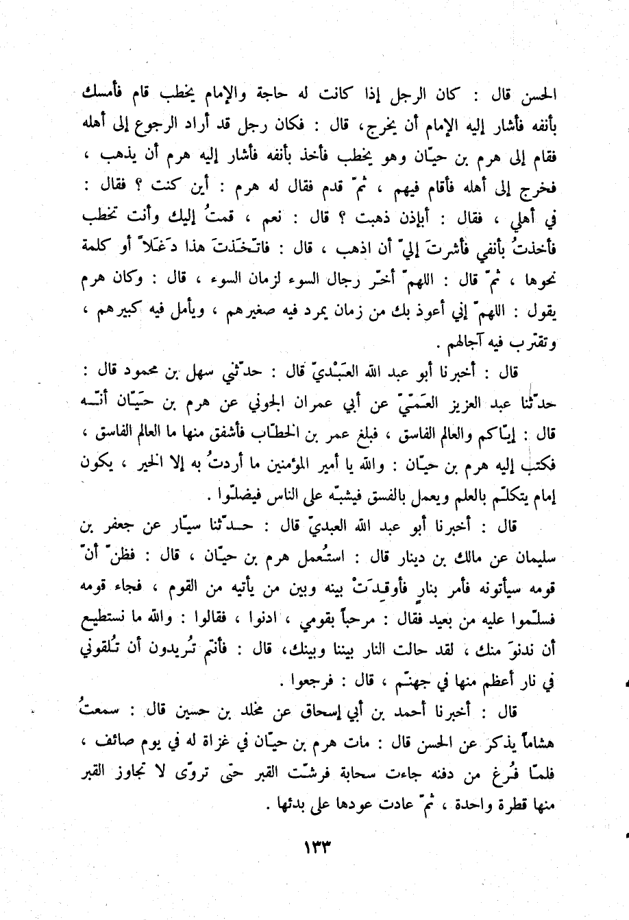 قَالَ: أَخْبَرَنَا أَحْمَدُ بْنُ أَبِي إِسْحَاقَ، عَنْ مَخْلَدِ بْنِ حُسَيْنٍ قَالَ: سَمِعْتُ هِشَامًا يَذْكُرُ، عَنِ الْحَسَنِ قَالَ: «§مَاتَ هَرِمُ بْنُ حَيَّانَ فِي غَزَاةٍ لَهُ فِي يَوْمٍ صَائِفٍ، فَلَمَّا فُرِغَ مِنْ دَفْنِهِ جَاءَتْ سَحَابَةٌ، فَرَشَّتِ الْقَبْرَ حَتَّى تَرَوَّى، لَا تُجَاوِزُ الْقَبْرَ مِنْهَا قَطْرَةٌ وَاحِدَةٌ، ثُمَّ عَادَتْ عَوْدَهَا عَلَى بَدْئِهَا»