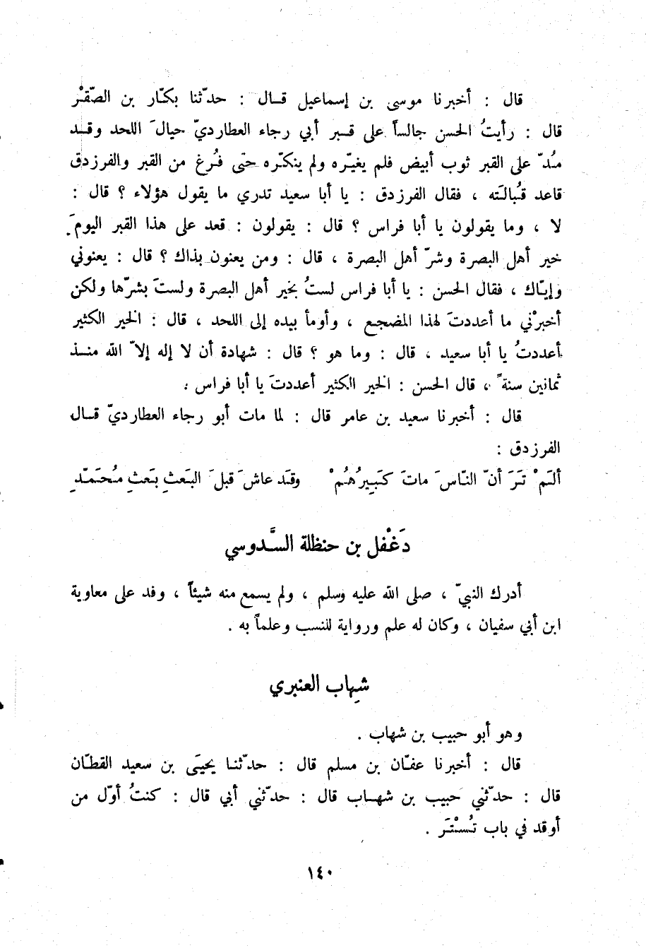 §دَغْفَلُ بْنُ حَنْظَلَةَ السَّدُوسِيُّ، أَدْرَكَ النَّبِيَّ صلّى الله عليه وسلم، وَلَمْ يَسْمَعْ مِنْهُ شَيْئًا، وَفَدَ عَلَى مُعَاوِيَةَ بْنِ أَبِي سُفْيَانَ، وَكَانَ لَهُ عِلْمٌ، وَرِوَايَةٌ لِلنَّسَبِ وَعِلْمًا بِهِ
