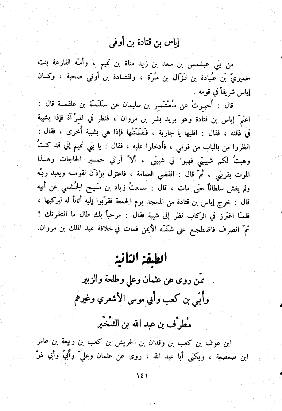 §مُطَرِّفُ بْنُ عَبْدِ اللَّهِ بْنِ الشِّخِّيرِ بْنِ عَوْفِ بْنِ كَعْبِ بْنِ وَقْدَانَ بْنِ الْحَرِيشِ بْنِ كَعْبِ بْنِ رَبِيعَةَ بْنِ عَامِرِ بْنِ صَعْصَعَةَ، وَيُكْنَى أَبَا عَبْدِ اللَّهِ، رَوَى عَنْ عُثْمَانَ، وَعَلِيٍّ، وَأُبَيٍّ، وَأَبِي ذَرٍّ -[142]-، وَأَبِيهِ، وَكَانَ ثِقَةً، لَهُ فَضْلٌ وَوَرَعٌ وَرِوَايَةٌ وَعَقْلٌ وَأَدَبٌ
