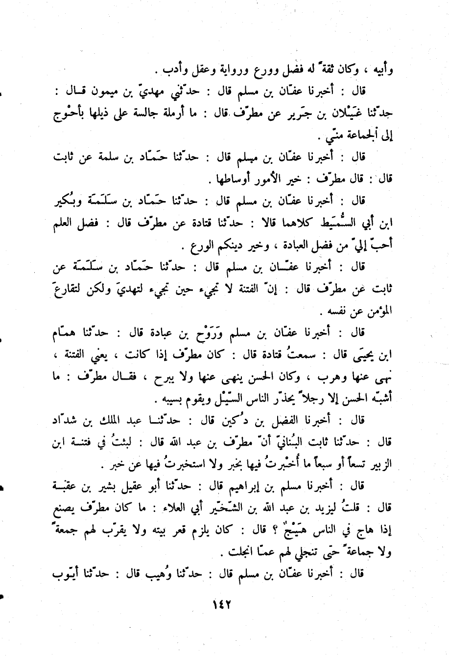 قَالَ: أَخْبَرَنَا عَفَّانُ بْنُ مُسْلِمٍ قَالَ: حَدَّثَنِي مَهْدِيُّ بْنُ مَيْمُونٍ قَالَ: حَدَّثَنَا غَيْلَانُ بْنُ جَرِيرٍ، عَنْ مُطَرِّفٍ قَالَ: «§مَا أَرْمَلَةٌ جَالِسَةٌ عَلَى ذَيْلِهَا بِأَحْوَجَ إِلَى الْجَمَاعَةِ مِنِّي»
