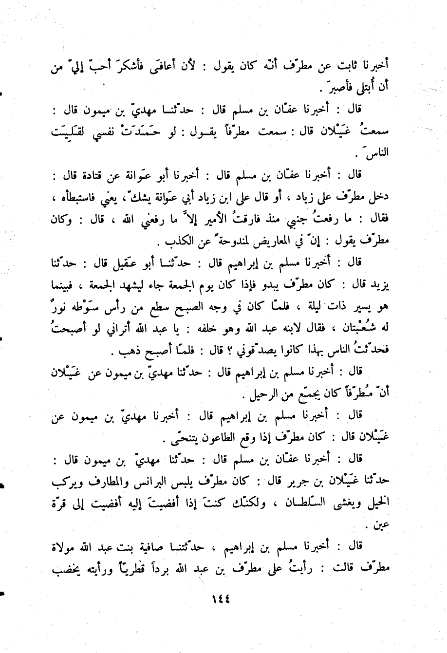 قَالَ: أَخْبَرَنَا عَفَّانُ بْنُ مُسْلِمٍ قَالَ: حَدَّثَنَا مَهْدِيُّ بْنُ مَيْمُونٍ قَالَ: حَدَّثَنَا غَيْلَانُ بْنُ جَرِيرٍ قَالَ: «§كَانَ مُطَرِّفٌ يَلْبَسُ الْبَرَانِسَ وَالْمَطَارِفُ، وَيَرْكَبُ الْخَيْلَ، وَيَغْشَى السُّلْطَانَ، وَلَكِنَّكَ كُنْتَ إِذَا أَفْضَيْتَ إِلَيْهِ أَفْضَيْتَ إِلَى قُرَّةِ عَيْنٍ»