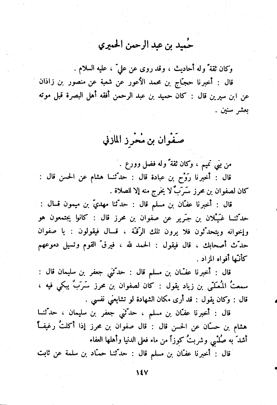 قَالَ: أَخْبَرَنَا رَوْحُ بْنُ عُبَادَةَ قَالَ: حَدَّثَنَا هِشَامٌ، عَنِ الْحَسَنِ قَالَ: «§كَانَ لِصَفْوَانَ بْنَ مُحْرِزٍ سَرَبٌ لَا يَخْرُجُ مِنْهُ إِلَّا لِلصَّلَاةِ»