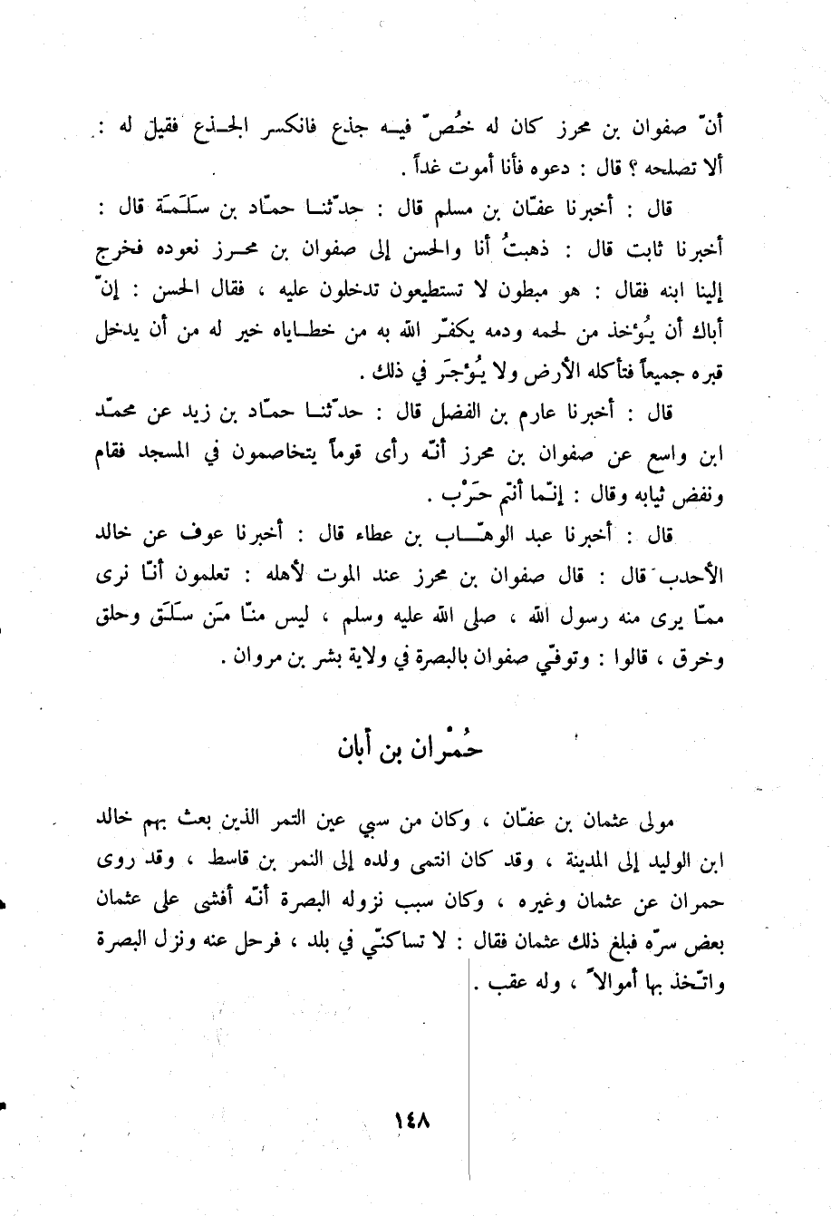 §حُمْرَانُ بْنُ أَبَانَ مَوْلَى عُثْمَانِ بْنِ عَفَّانَ، وَكَانَ مِنْ سَبْيِ عَيْنِ التَّمْرِ الَّذِينَ بَعَثَ بِهِمْ خَالِدُ بْنُ الْوَلِيدِ إِلَى الْمَدِينَةِ، وَقَدْ كَانَ انْتَمَى وَلَدُهُ إِلَى النَّمِرِ بْنِ قَاسِطٍ، وَقَدْ رَوَى حُمْرَانُ عَنْ عُثْمَانَ وَغَيْرِهِ، وَكَانَ سَبَبَ نُزُولِهِ الْبَصْرَةَ أَنَّهُ أَفْشَى عَلَى عُثْمَانَ بَعْضَ سَرِّهِ، فَبَلَغَ ذَلِكَ عُثْمَانَ، فَقَالَ: «لَا تُسَاكِنِّي فِي بَلَدٍ» فَرَحَلَ عَنْهُ، وَنَزَلَ الْبَصْرَةَ، وَاتَّخَذَ بِهَا أَمْوَالًا، وَلَهُ عَقِبٌ
