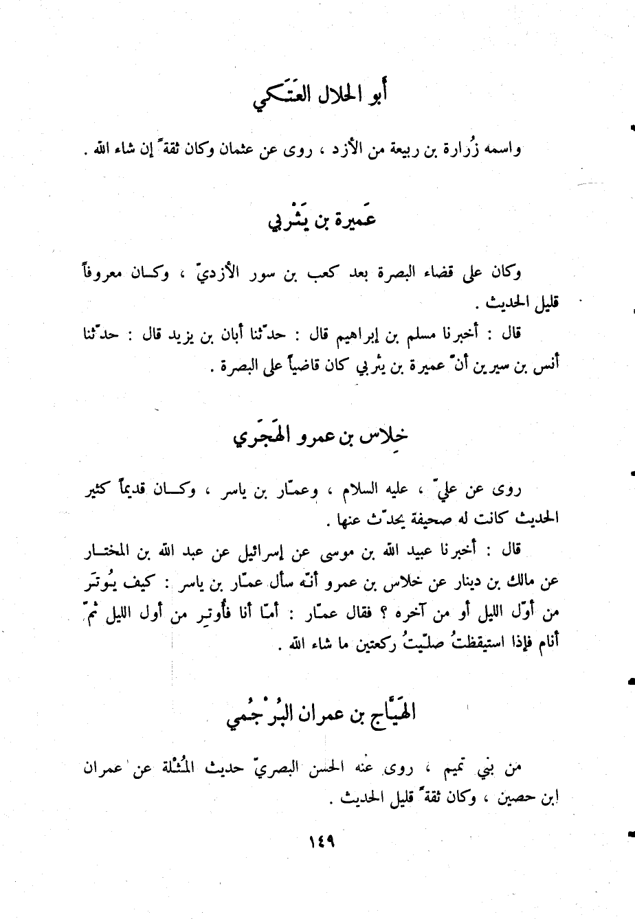 §خِلَاسُ بْنُ عَمْرٍو الْهَجَرِيُّ رَوَى عَنْ عَلِيٍّ، عَلَيْهِ السَّلَامُ، وَعَمَّارِ بْنِ يَاسِرٍ، وَكَانَ قَدِيمًا، كَثِيرَ الْحَدِيثِ، كَانَتْ لَهُ صَحِيفَةٌ يُحَدِّثُ عَنْهَا
