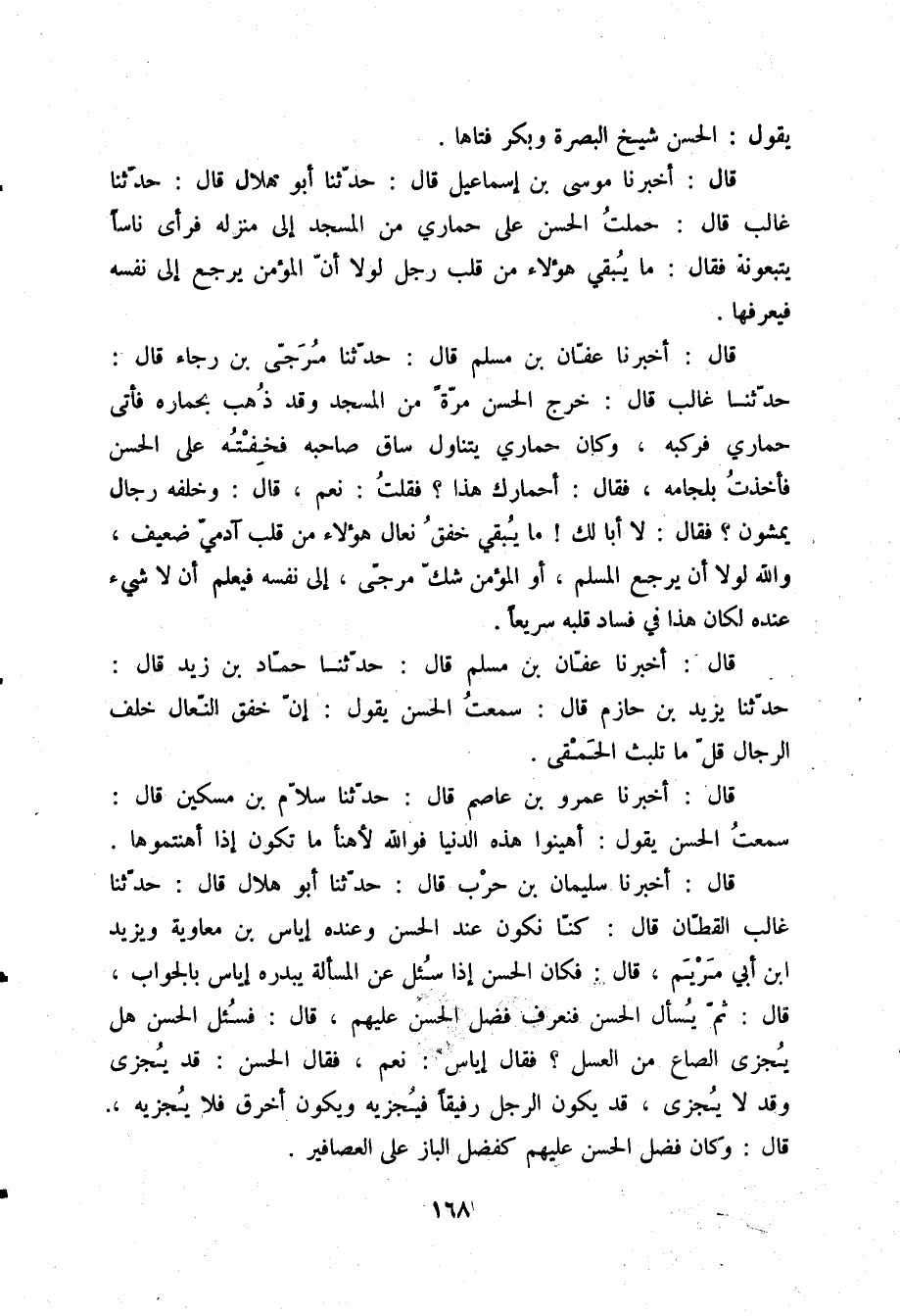 قَالَ: أَخْبَرَنَا عَفَّانُ بْنُ مُسْلِمٍ قَالَ: حَدَّثَنَا مُرَجَّى بْنُ رَجَاءٍ قَالَ: حَدَّثَنَا غَالِبٌ قَالَ: خَرَجَ الْحَسَنُ مَرَّةً مِنَ الْمَسْجِدِ، وَقَدْ ذُهِبَ بِحِمَارِهِ، فَأَتَى حِمَارِي، فَرَكِبَهُ، وَكَانَ حِمَارِي يَتَنَاوَلُ سَاقَ صَاحِبِهِ، فَخِفْتُهُ عَلَى الْحَسَنِ، فَأَخَذْتُ بِلِجَامِهِ، فَقَالَ: «أَحِمَارُكَ هَذَا؟» فَقُلْتُ: نَعَمْ قَالَ: وَخَلْفَهُ رِجَالٌ يَمْشُونَ؟ فَقَالَ: «لَا أَبَا لَكَ، §مَا يُبْقِي خَفْقُ نِعَالِ هَؤُلَاءِ مِنْ قَلْبِ آدَمَيٍّ ضَعِيفٍ، وَاللَّهِ لَوْلَا أَنْ يَرْجِعَ الْمُسْلِمُ - أَوِ الْمُؤْمِنُ - شَكَّ مُرَجَّى - إِلَى نَفْسِهِ، فَيَعْلَمُ أَنْ لَا شَيْءَ عِنْدَهُ لَكَانَ هَذَا فِي فَسَادِ قَلْبِهِ سَرِيعًا»