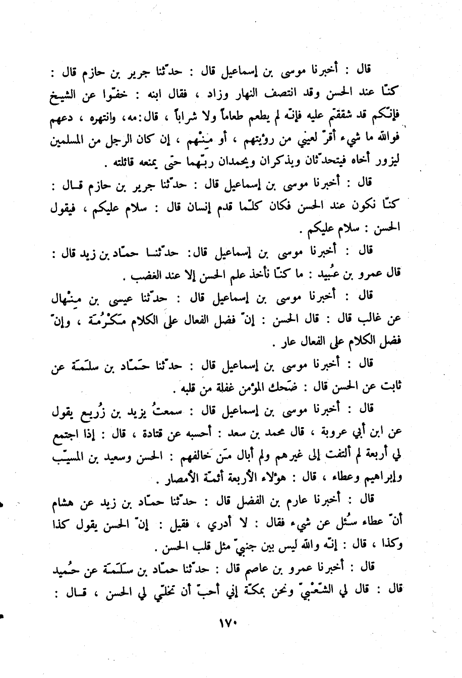 قَالَ: أَخْبَرَنَا مُوسَى بْنُ إِسْمَاعِيلَ قَالَ: حَدَّثَنَا جَرِيرُ بْنُ حَازِمٍ قَالَ: " كُنَّا نَكُونُ عِنْدَ الْحَسَنِ، فَكَانَ كُلَّمَا قَدِمَ إِنْسَانٌ قَالَ: §سَلَامٌ عَلَيْكُمْ فَيَقُولُ الْحَسَنُ ": «سَلَامٌ عَلَيْكُمْ»
