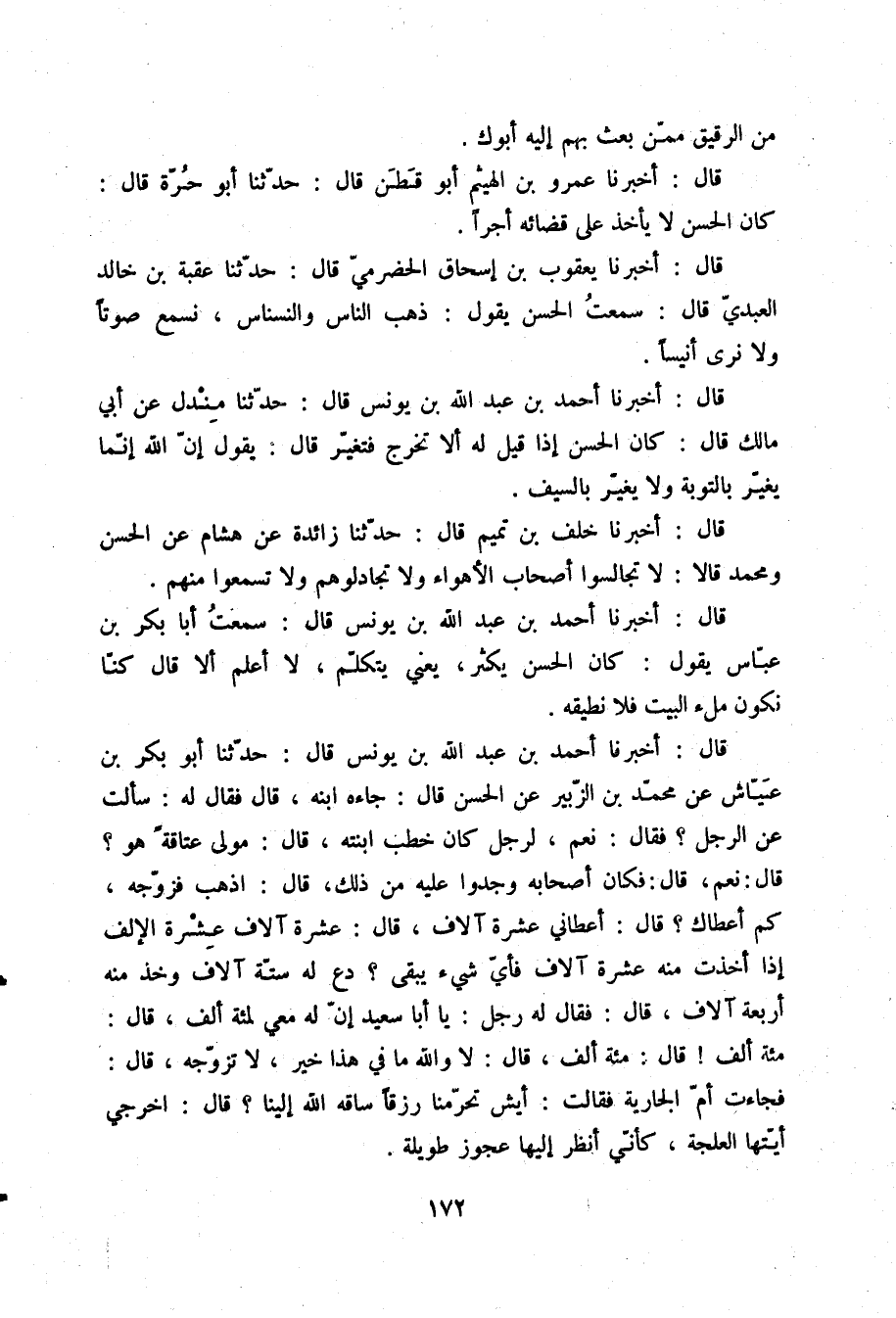 قَالَ: أَخْبَرَنَا عَمْرُو بْنُ الْهَيْثَمِ أَبُو قَطَنٍ قَالَ: حَدَّثَنَا أَبُو حُرَّةَ قَالَ: §كَانَ الْحَسَنُ لَا يَأْخُذُ عَلَى قَضَائِهِ أَجْرًا