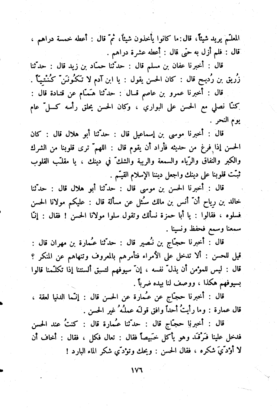 قَالَ: أَخْبَرَنَا مُوسَى بْنُ إِسْمَاعِيلَ قَالَ: حَدَّثَنَا أَبُو هِلَالٍ قَالَ: كَانَ الْحَسَنُ إِذَا فَرَغَ مِنْ حَدِيثِهِ، فَأَرَادَ أَنْ يَقُومَ قَالَ: «اللَّهُمَّ §تَرَى قُلُوبَنَا مِنَ الشِّرْكِ وَالْكِبْرِ وَالنِّفَاقِ وَالرِّيَاءِ وَالسُّمْعَةِ وَالرِّيبَةِ وَالشَّكِّ فِي دِينِكَ، يَا مُقَلِّبَ الْقُلُوبِ، ثَبِّتْ قُلُوبَنَا عَلَى دِينِكَ، وَاجْعَلْ دِينَنَا الْإِسْلَامَ الْقَيِّمَ»