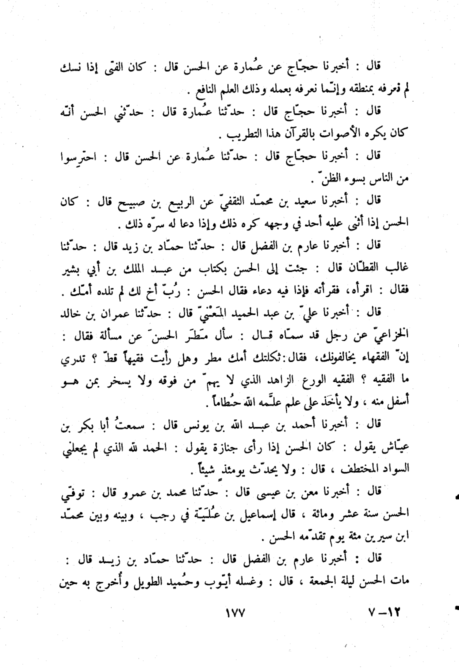 قَالَ: أَخْبَرَنَا أَحْمَدُ بْنُ عَبْدِ اللَّهِ بْنِ يُونُسَ قَالَ: سَمِعْتُ أَبَا بَكْرِ بْنَ عَيَّاشٍ يَقُولُ: كَانَ الْحَسَنُ إِذَا رَأَى جَنَازَةً يَقُولُ: «§الْحَمْدُ لِلَّهِ الَّذِي لَمْ يَجْعَلْنِي السَّوَادَ الْمُخْتَطَفَ» قَالَ: وَلَا يُحَدِّثُ يَوْمَئِذٍ شَيْئًا