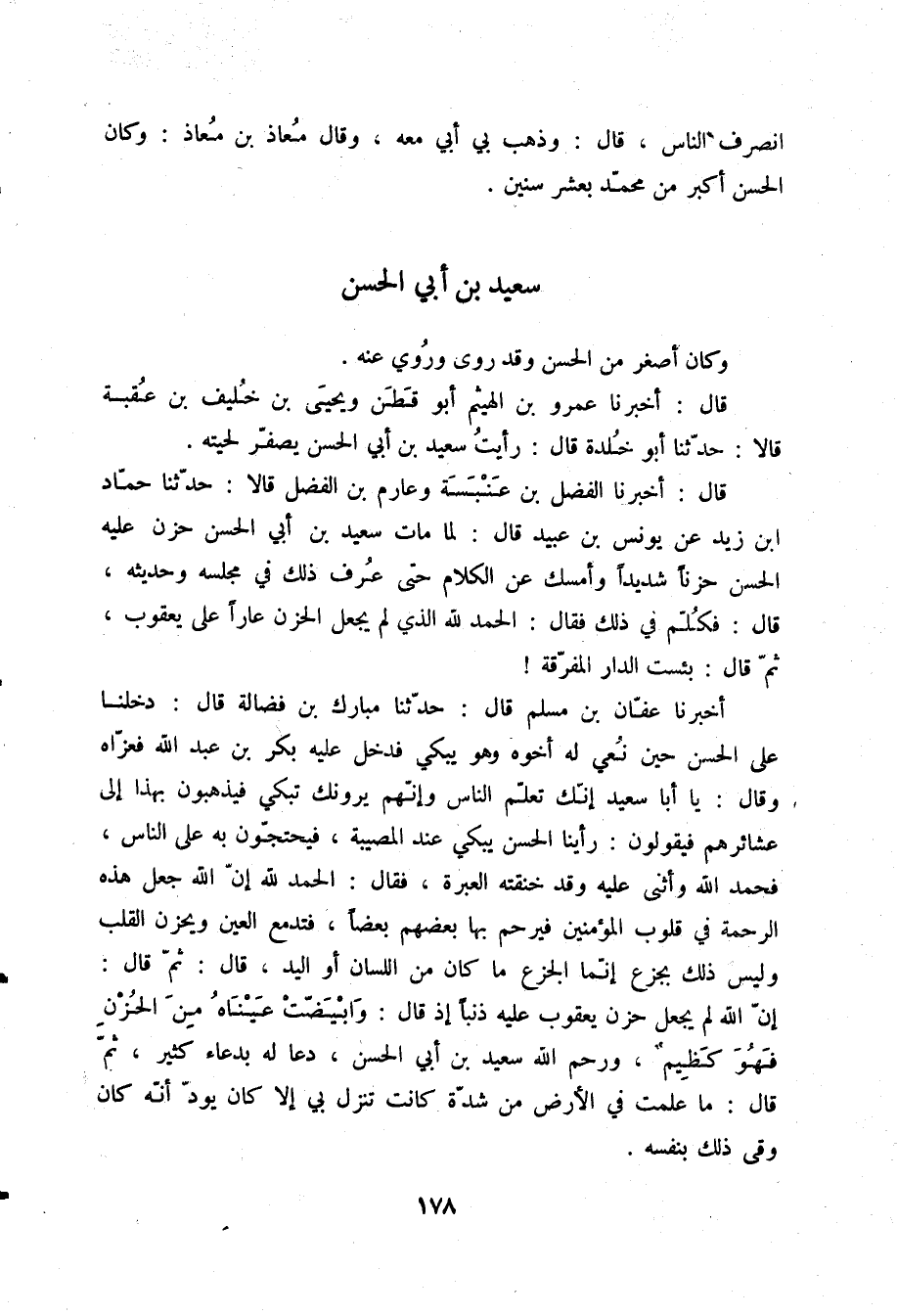 قَالَ: أَخْبَرَنَا عَفَّانُ بْنُ مُسْلِمٍ قَالَ: حَدَّثَنَا مُبَارَكُ بْنُ فَضَالَةَ قَالَ: §دَخَلْنَا عَلَى الْحَسَنِ حِينَ نُعِيَ لَهُ أَخُوهُ وَهُوَ يَبْكِي، فَدَخَلَ عَلَيْهِ بَكْرُ بْنُ عَبْدِ اللَّهِ، فَعَزَّاهُ، وَقَالَ: يَا أَبَا سَعِيدٍ، إِنَّك تُعَلِّمُ النَّاسَ، وَإِنَّهُمْ يَرَوْنَكَ تَبْكِي، فَيَذْهَبُونَ بِهَذَا إِلَى عَشَائِرِهِمْ، فَيَقُولُونَ رَأَيْنَا الْحَسَنَ يَبْكِي عِنْدَ الْمُصِيبَةِ، فَيَحْتَجُّونَ بِهِ عَلَى النَّاسِ فَحَمِدَ اللَّهَ وَأَثْنَى عَلَيْهِ، وَقَدْ خَنَقَتْهُ الْعَبْرَةُ، فَقَالَ: الْحَمْدُ لِلَّهِ، إِنَّ اللَّهَ جَعَلَ هَذِهِ الرَّحْمَةَ فِي قُلُوبِ الْمُؤْمِنِينَ، فَيَرْحَمُ بِهَا بَعْضُهُمْ بَعْضًا، فَتَدْمَعُ الْعَيْنُ، وَيَحْزَنُ الْقَلْبُ، وَلَيْسَ ذَلِكَ بِجَزَعٍ، إِنَّمَا الْجَزَعُ مَا كَانَ مِنَ اللِّسَانِ أَوِ الْيَدِ، قَالَ: ثُمَّ قَالَ: إِنَّ اللَّهَ لَمْ يَجْعَلْ حُزْنَ يَعْقُوبَ عَلَيْهِ ذَنْبًا إِذْ قَالَ: {وَابْيَضَّتْ عَيْنَاهُ مِنَ الْحُزْنِ فَهُوَ كَظِيمٌ} [يوسف: 84] ، وَرَحِمَ اللَّهُ سَعِيدَ بْنَ أَبِي الْحَسَنِ، دَعَا لَهُ بِدُعَاءٍ كَثِيرٍ، ثُمَّ قَالَ: مَا عَلِمْتُ فِي الْأَرْضِ مِنْ شِدَّةٍ كَانَتْ تَنْزِلُ بِي إِلَّا كَانَ يَوَدُّ أَنَّهُ كَانَ وَقَى ذَلِكَ بِنَفْسِهِ