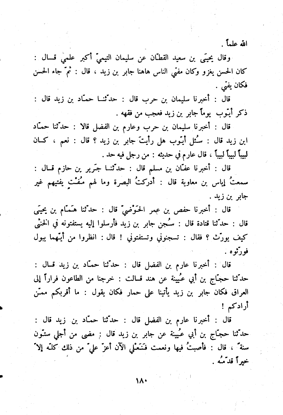 قَالَ: أَخْبَرَنَا سُلَيْمَانُ بْنُ حَرْبٍ قَالَ: حَدَّثَنَا حَمَّادُ بْنُ زَيْدٍ قَالَ: «§ذَكَرَ أَيُّوبُ يَوْمًا جَابِرَ بْنَ زَيْدٍ، فَعَجِبَ مِنْ فِقْهِهِ»